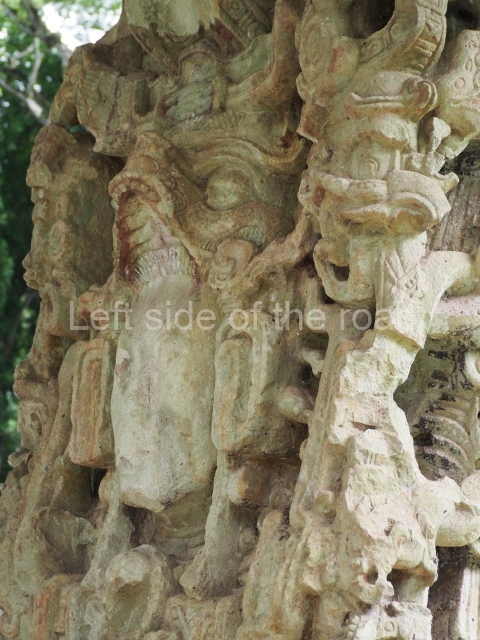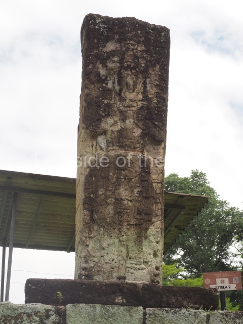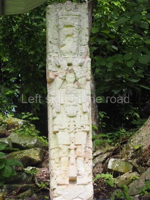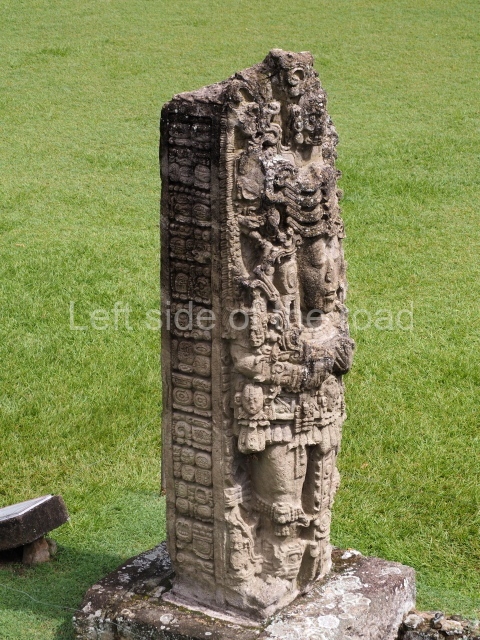 Stela P. Butz’ Chan, Ruler 11, is depicted here in an unusual pose: to a certain extent the stela repeats the classic pose of the Copan rulers holding a doubleheaded ceremonial bar, but the stone tapers towards the bottom, an effect that is further enhanced by a relief that also tapers towards the bottom, on the rock background.
