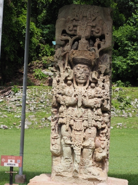 Stelae A, 4, B, C, F, H and D. Waxaklajuun Ubaah K’awiil, Ruler 13, left this magnificent group of seven finely executed stelae in the central plaza, accompanied by their respective altars. Stela A, whose original is on display in the Sculpture Museum, was dedicated in AD 731; the text on the right-hand side of the ruler contains references to Palenque, Tikal and Calakmul, as well as Copan, although the overall text is proving difficult to decipher. Stela 4 commemorates an important date for the dynasty: 8.6.0.0.0. The relief is unusually deep, and on the rear side the dignitary’s large headdress is composed of groups of feathers seemingly secured by buttons just before the ends. Stela B shows the bearded ruler emerging from the mouth of a cosmic monster, in which it is possible to discern the upper teeth on both sides and above the figures’ feet. He is accompanied by several small dignitaries, probably ancestors. The rear part of the stela shows the head of a cosmic monster. Stela C depicts the governor on both sides of the sculpture, commemorating the end of Katun 9.14.0.0.0; traces of red paint can be discerned on different parts of the monument. There are also crocodile heads, most notably on the trusses between his legs. A rope runs around every side of the stela linking the dignitaries at the top to other distinctive elements in every representation, culminating at the bottom of the monument; the same ropes also frame the glyphic cartouches on the sides. Stela F shows an exquisite, almost free-standing carving of the ruler. Again, a rope runs around the sculpture; the tops of the glyphs, grouped into fours, are inscribed inside the circles traced by the rope. Stela H shows Waxaklajuun as the Maize God. Standing slightly apart from the former stelae, at the north end of the plaza, is Stela D, the last one representing the long-lived ruler. It is accompanied by an altar that depicts a jawless deity, who is gaunt on one side and fleshy on the other; situated behind the stelae are a few glyphic steps. Although the sculpture is not as finely executed as the former examples, its rear face has glyphs of complete figures.