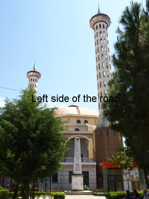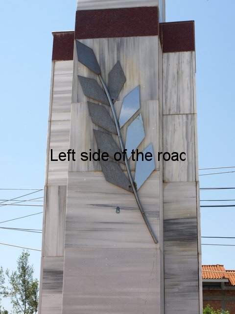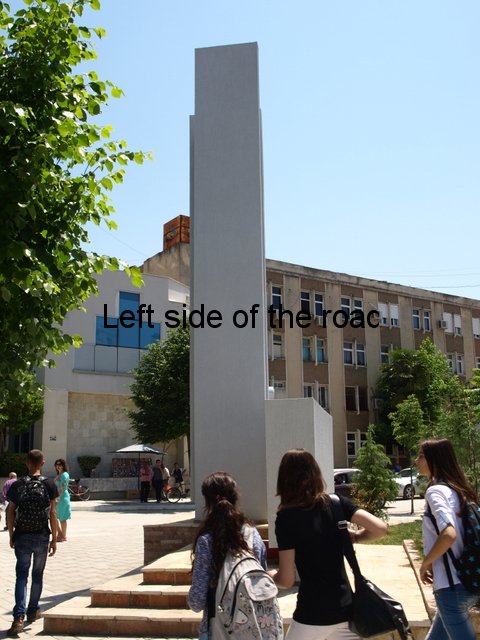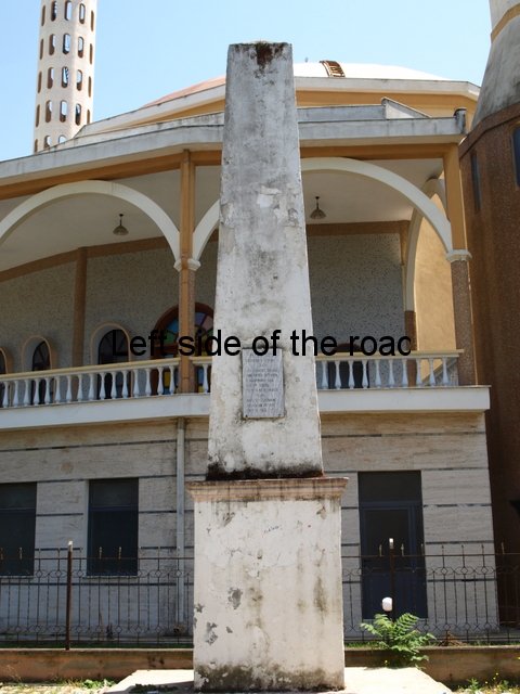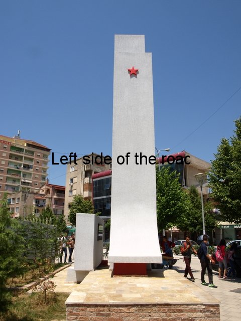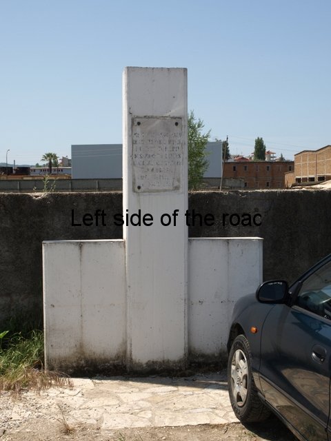 The third lapidar in Fier is different again. It’s a simple monolith, which is made grander by being placed on a plinth, and is in the public park in the centre of the town. On the side facing the centre of the park there’s a marble plaque with an inscription. The park is now considerably smaller than it would have been when the lapidar was first installed as a huge chunk of it has been taken up by a large mosque. Considering that all the other lapidars in the town have been cleaned recently this one is showing signs of wear, although structurally sound, and the inscription – black paint in the carved marble – is showing signs of wear it’s still quite easy to read the words.