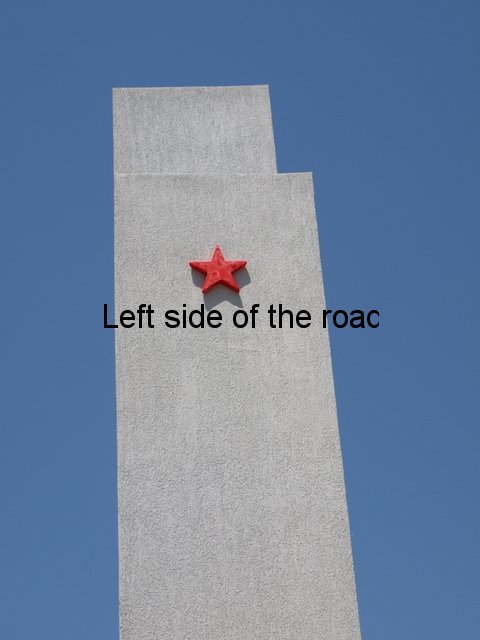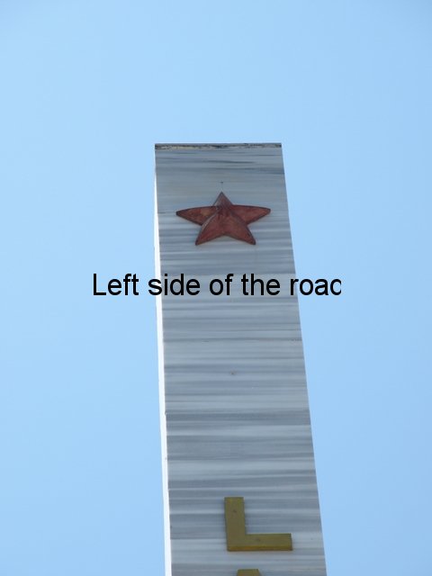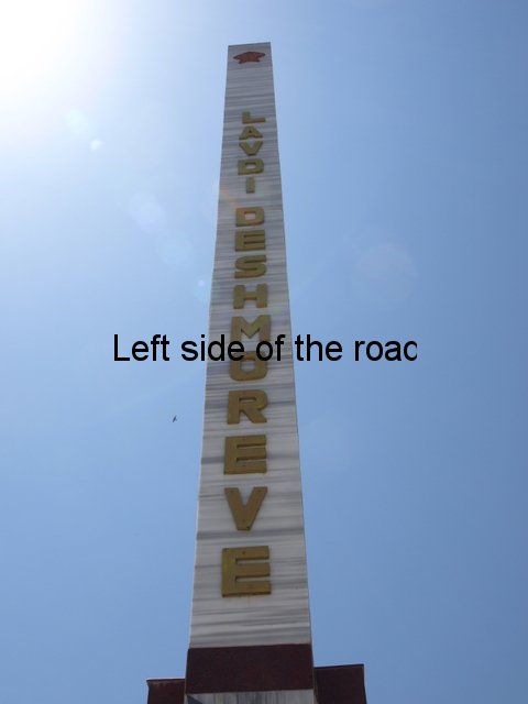 There’s also been a bit of cost cutting on the metal decoration on the main face. At the bottom there’s a large laurel branch with nine leaves. This looks to be treated sheet steel but there are signs of rust appearing at the joins of the leaves and the branch. Higher up the words ‘Lavdi Deshmoreve’ (‘Glory to the Martyrs) runs in large, golden letters vertically from the top down. From a distance this looks quite smart but once close up you can see that the letters have been made out of sheet steel, boxed, in three dimensions and then painted with gold paint. The elements are starting to take their toll and the paint is fading and rust is starting to show. At the top of the column, a few centimetres from the top, is a large, red, metal star – the symbol of Communism.