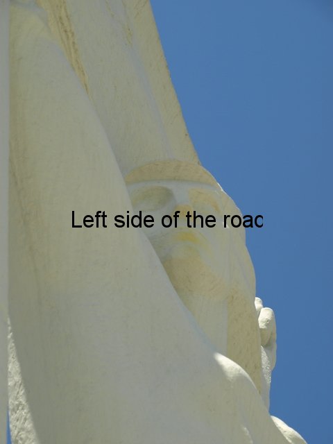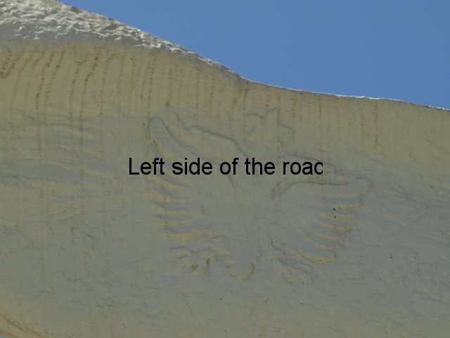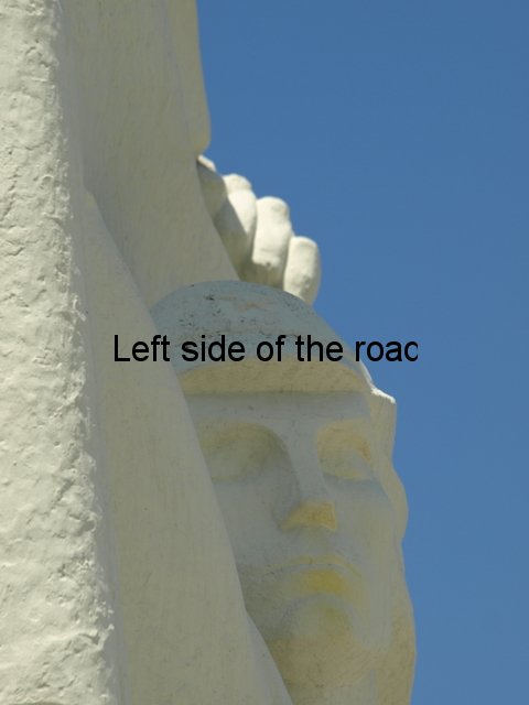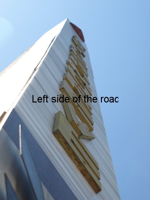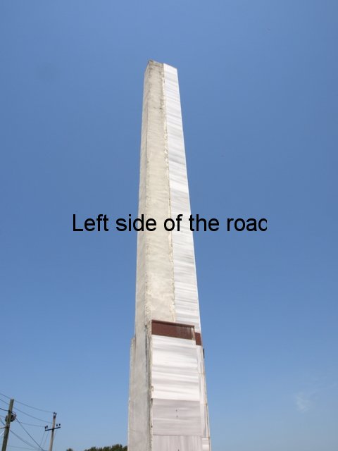 Both consist of a platform, which has three steps on the right hand side of the long edge which continue on the right hand narrow edge. On this platform a monolith rises up to a height of about eight. On the left hand side of this monolith there’s a curved buttress at the bottom. It’s here where there’s a slight difference between the old and the new. On the old this right hand structure is joined by another rectangular slab of concrete which extends upwards about a metre over the first. On the new there is a space between these two components and the concrete in between is painted a deep red, which continues from under the curved buttress. On both the versions a concrete slab about 2 x 4 metres is placed at 90º to the lapidar.
