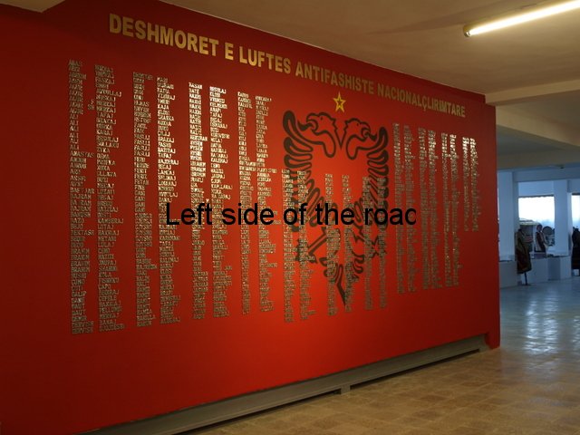 In some of the Martyrs’ cemeteries there’s a list of all those from the area who died in the war. However, this is not the case in Fier. On the first floor (which documents the period from pre-war years to 1990) of the Fier Historical Museum there’s a wall of remembrance, listing those from the Fier district who gave their lives for National Liberation. Although a recent creation it has all the aspects you’d expect from the Socialist period. The background is the Communist red and in the centre there’s a large black, double-headed eagle. Over the two heads is a golden star. At the very top are the words ‘Deshmoret e luftes antifashiste nacionalçlirimtare’ (Martyrs of the National Liberation War) in gold letters. And then, also in gold letters, are the names of 443 men and women from the Fier district – many more than are commemorated with a tomb in the cemetery.