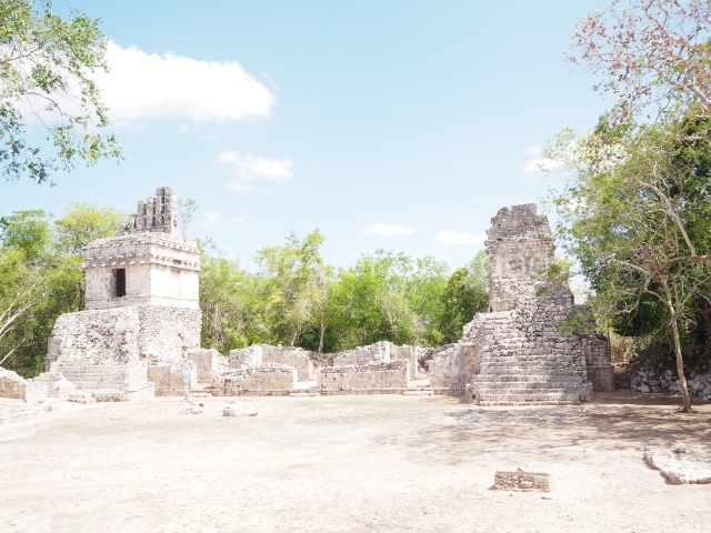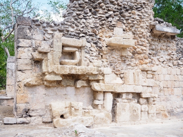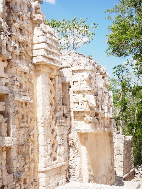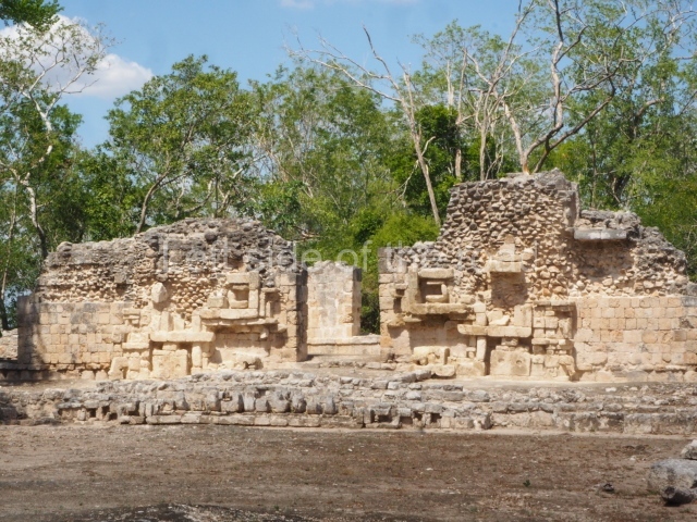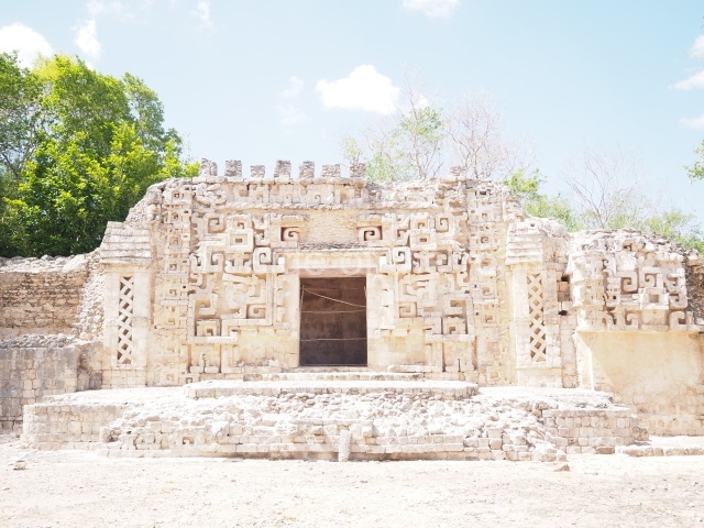 Kabah contains material evidence and works of architecture that clearly demonstrate the degree of complexity, in terms of social organisation, achieved by the Maya in the Puuc region. The most outstanding buildings at the site are the Codz Pop (also known as the Palace of Masks), the plazas of the Palace and the Temple of columns to the east, the Mirador and manos rojas groups to the west, and the Early group, the Great pyramid and its plaza, and the Arch providing access to the monumental area at the centre of the site; all of these display an extraordinary understanding of aesthetics in their architectural design as well as incorporating aspects typical of the different styles in the northern lowlands during the Classic era. Three large groups form the core area at Kabah. The Palace plaza is characteristic of the Puuc architecture developed between the 7th and 10th centuries AD, from the Early Puuc style of the Temple of the sun to the intermediate style visible in the vast Teocalli and finally the Palace, whose classical walls and friezes decorated with colonnettes and tiny drums define it as a prototype of Puuc architecture. But it is the palatial sanctuary of the codz pop that genuinely characterises Kabah. The most outstanding aspects of this building are its facades: the west facade, which has over 250 masks of Chac and is covered with carved, mosaic-like stones from the bottom of the walls to the cornice; and the east facade, nowadays partly restored, whose walls are decorated with extended mats, seven warriors or heroes on the frieze of the three central rooms, and exquisitely sculpted jambstones flanking the main entrance, which display the latest date in the north of the peninsula (AD 987), scenes of a ritual dance and the capture and death of an important figure. Situated some 600 m from the Mirador, the Codz Pop is a monumental single-storey construction with a variable two bays and an architectural plan in the shape of the letter T or IK.