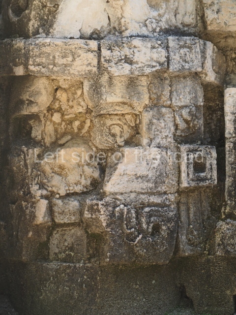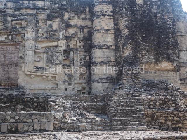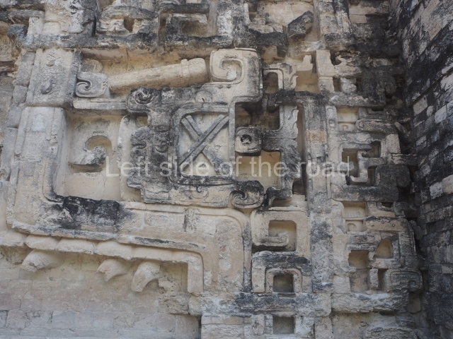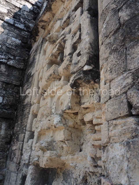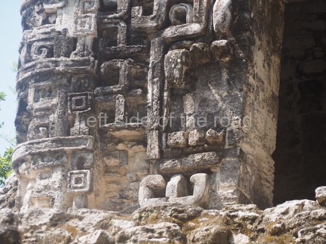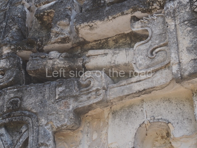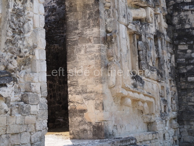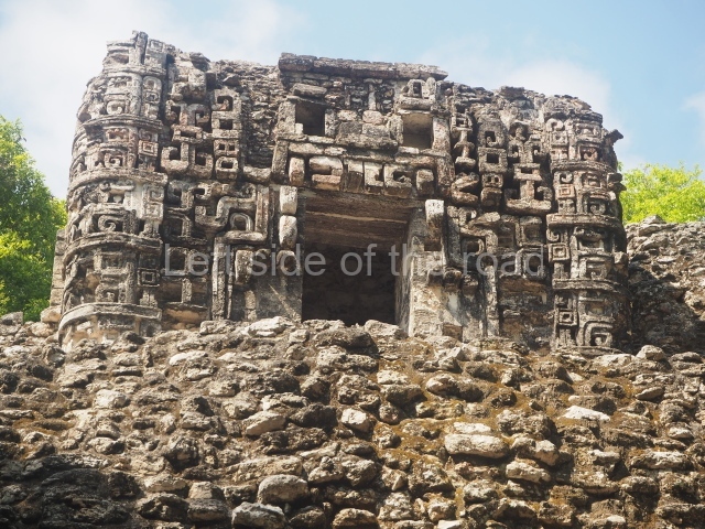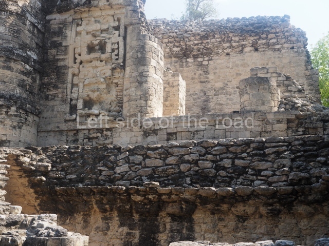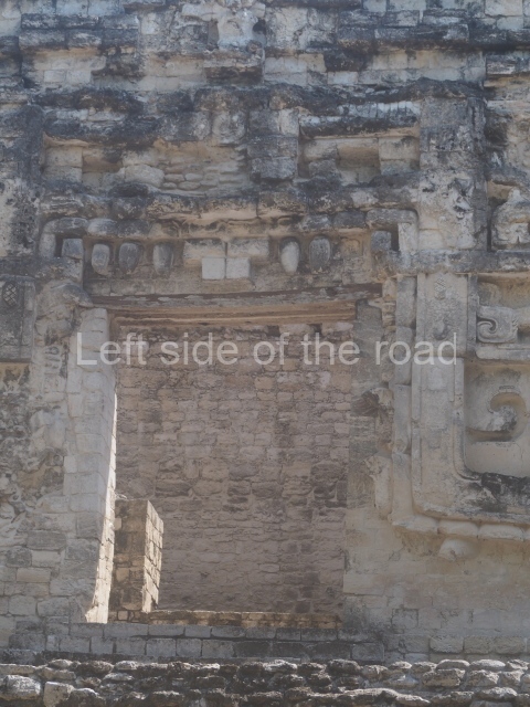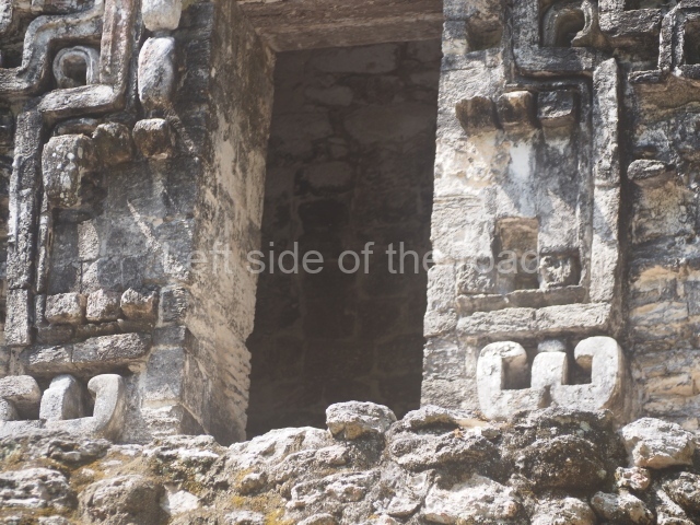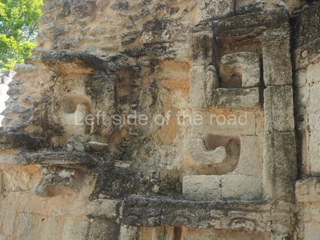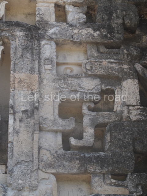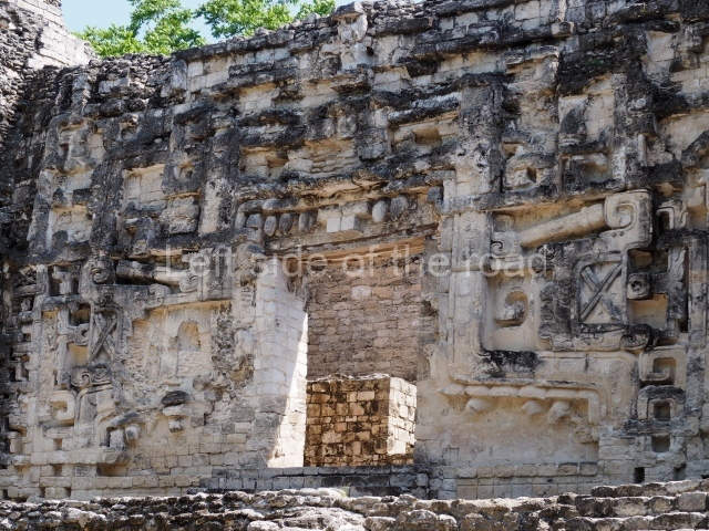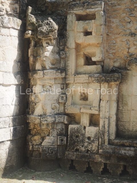 The central room reproduces the enormous jaws of the Earth Monster or Itzamna, which is flanked by stacks of masks viewed in profile. These are in turn framed by stylised images of houses with the woven mat motif at the entrances, the symbol of political authority. On the flat roof it is still possible to see the remains of a perforated roof comb which appears to have had 13 stucco sculptures of humans. The other two rooms had smooth lower walls and a frieze decorated with eyes and teeth above the entrance, ear ornaments on both sides and four stacked masks at each corner. All three rooms had a bench along the interior east wall.