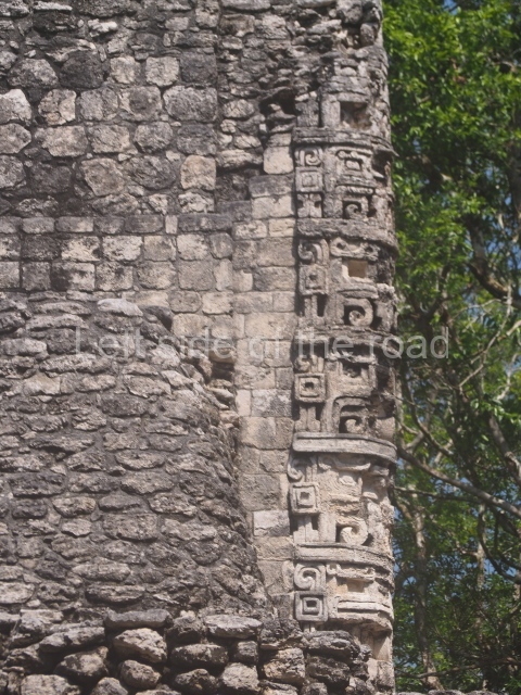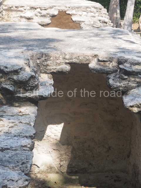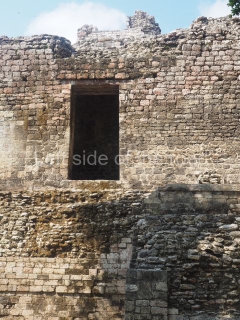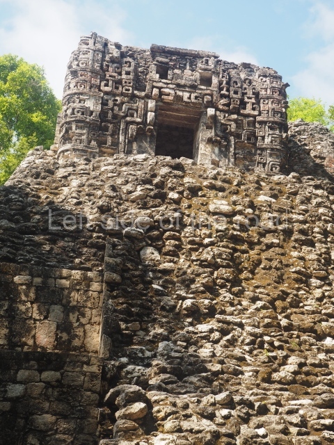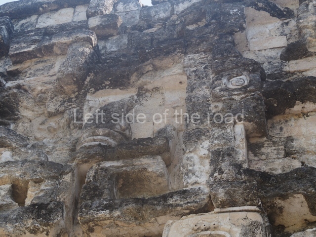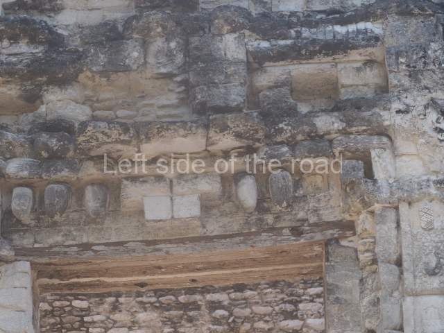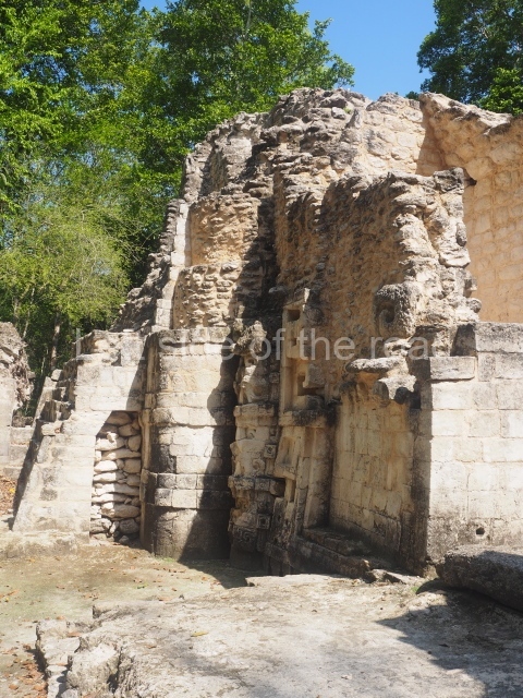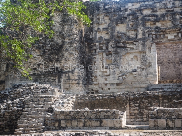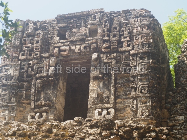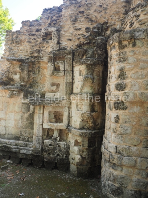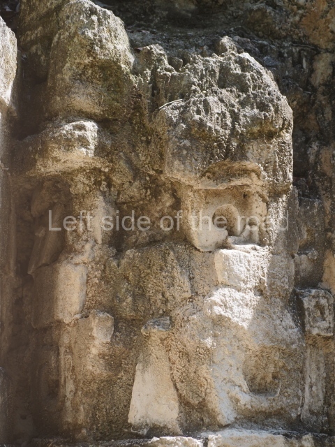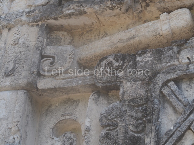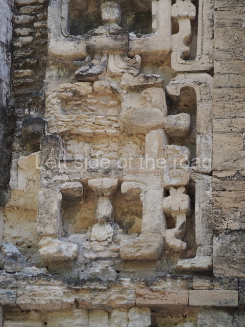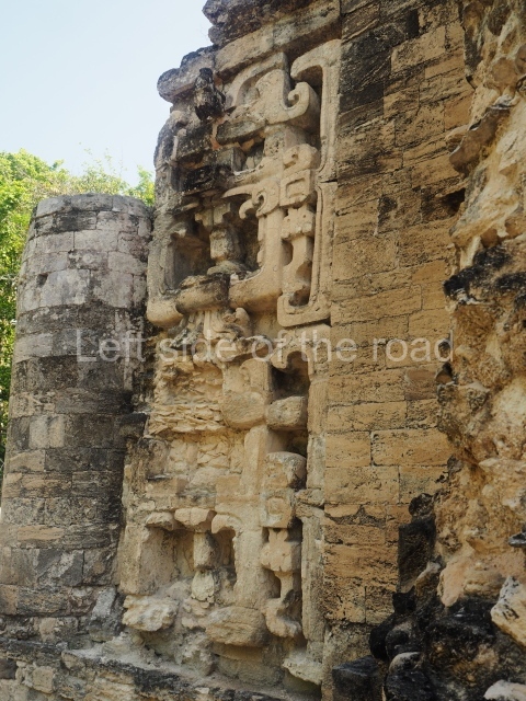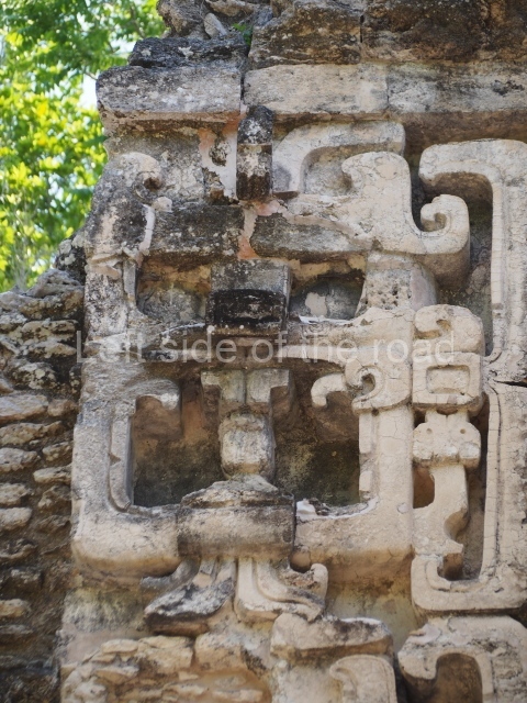 The central room reproduces the enormous jaws of the Earth Monster or Itzamna, which is flanked by stacks of masks viewed in profile. These are in turn framed by stylised images of houses with the woven mat motif at the entrances, the symbol of political authority. On the flat roof it is still possible to see the remains of a perforated roof comb which appears to have had 13 stucco sculptures of humans. The other two rooms had smooth lower walls and a frieze decorated with eyes and teeth above the entrance, ear ornaments on both sides and four stacked masks at each corner. All three rooms had a bench along the interior east wall.
