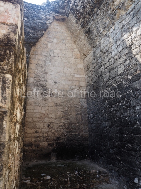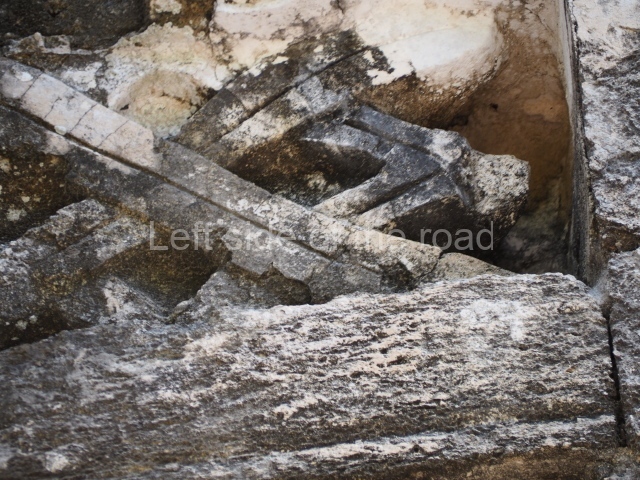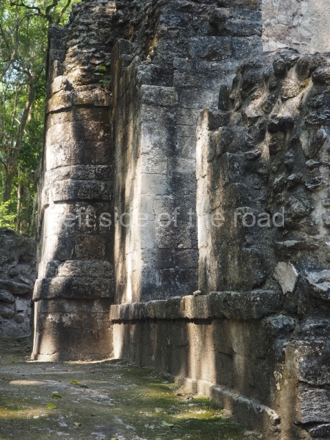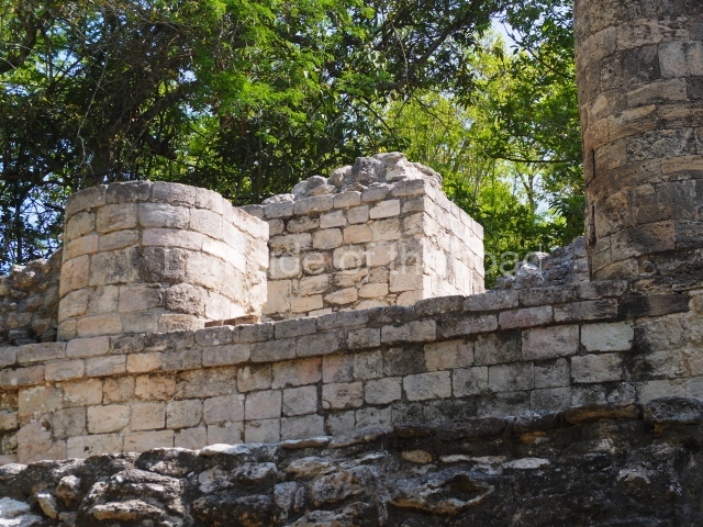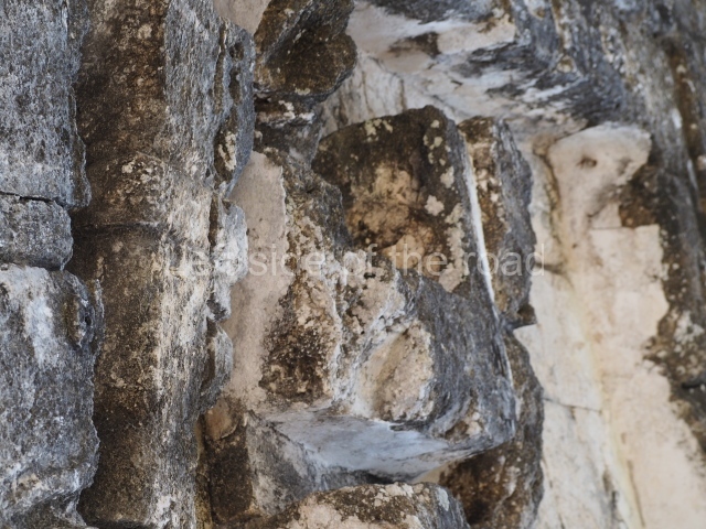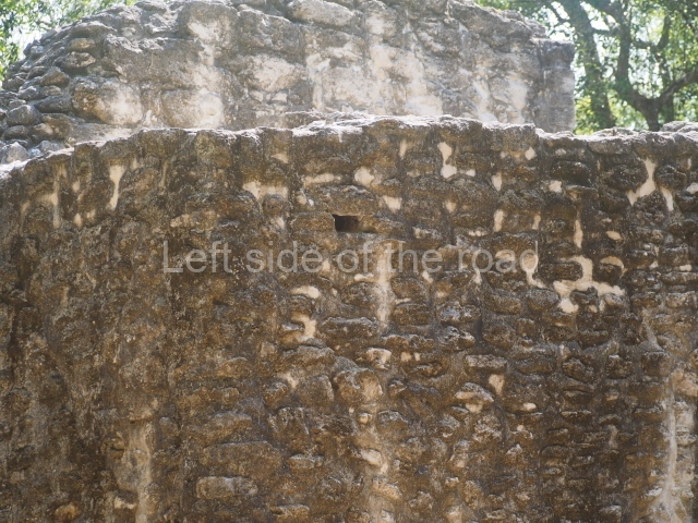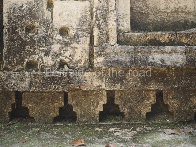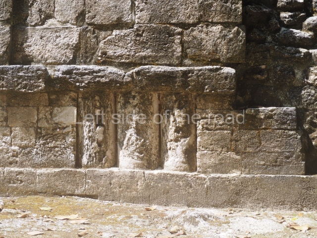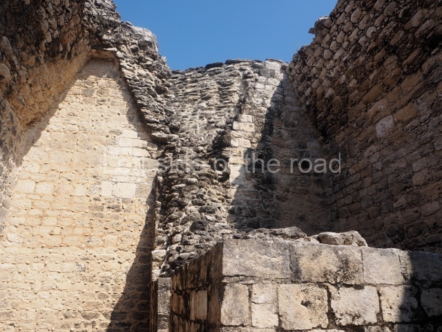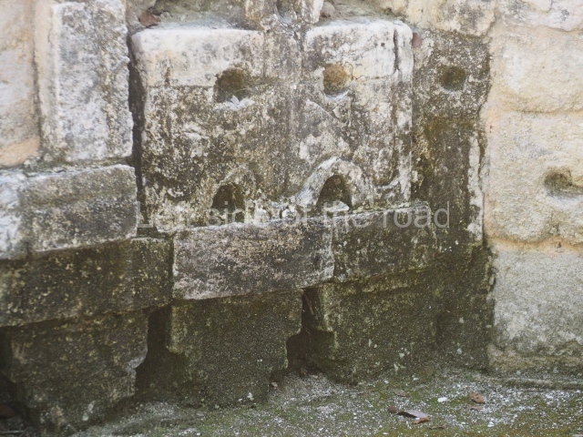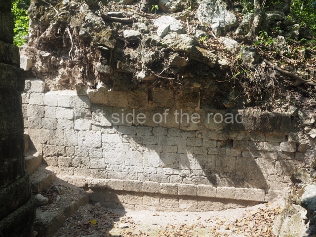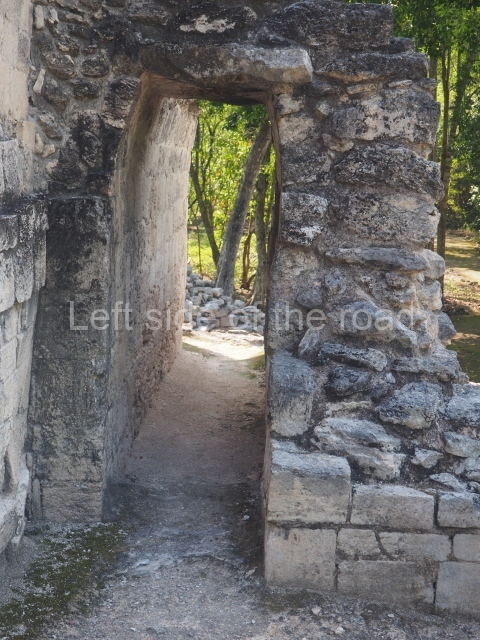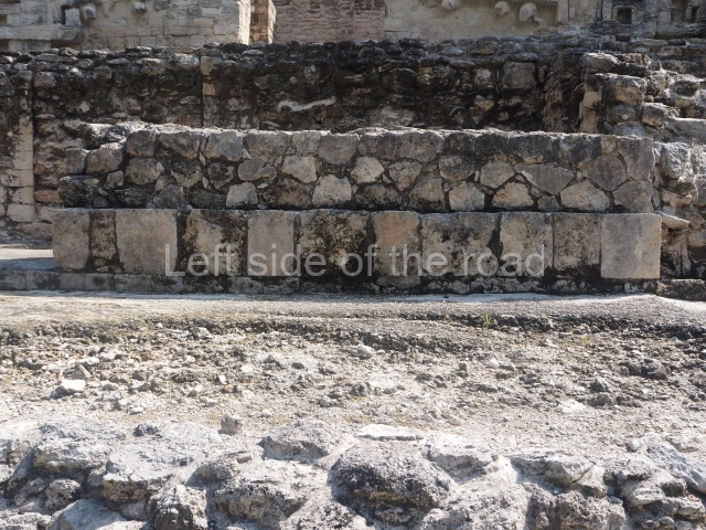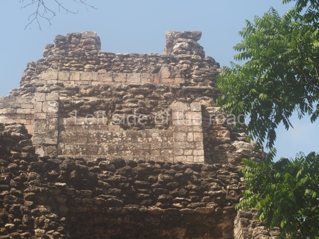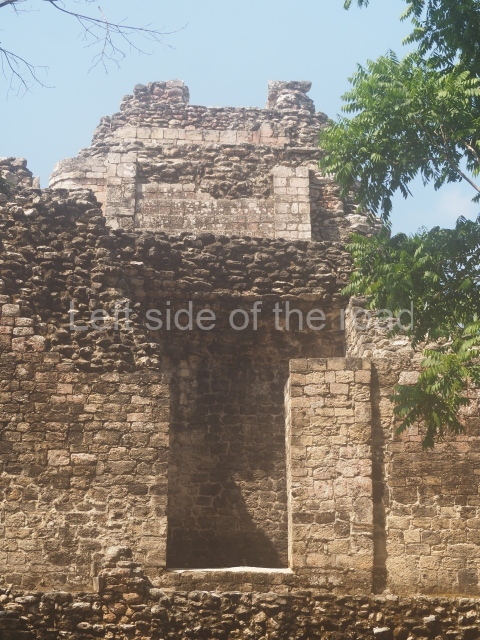 The central room reproduces the enormous jaws of the Earth Monster or Itzamna, which is flanked by stacks of masks viewed in profile. These are in turn framed by stylised images of houses with the woven mat motif at the entrances, the symbol of political authority. On the flat roof it is still possible to see the remains of a perforated roof comb which appears to have had 13 stucco sculptures of humans. The other two rooms had smooth lower walls and a frieze decorated with eyes and teeth above the entrance, ear ornaments on both sides and four stacked masks at each corner. All three rooms had a bench along the interior east wall.