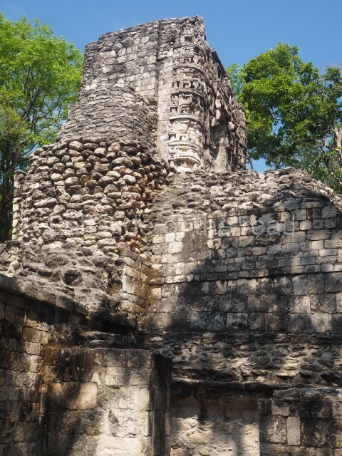 This two-tier partially excavated building is situated approximately 60 m north of the previous structure. The ground-floor tier once contained a series of large rooms, while the central part of this level is enhanced by a small platform with a temple. Behind the stairway is a passageway that not only saved filling material but also facilitated the flow of movement through the building. The profuse temple decoration evokes a type of horror of the void, with volutes and iconographic elements covering the entire surface. The main entrance very clearly imitates the jaws of the Earth Monster, with its curvilinear teeth. On both sides of the entrance, forming the corners of the building, are stacks of masks; such features are typical of the architecture still visible on buildings in the region, such as Structure XX at Chicanna and the temple-palace at Tabasqueno, in north-eastern Campeche.