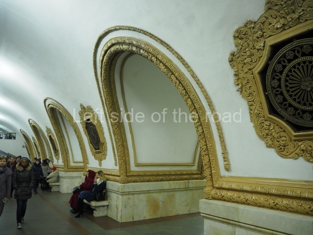 Kiyevskaya has no vestibule of its own. Instead, escalators at the end of the hall lead to Kiyevskaya and thence to that station’s entrance, which is built into the Kiyevsky railway station.