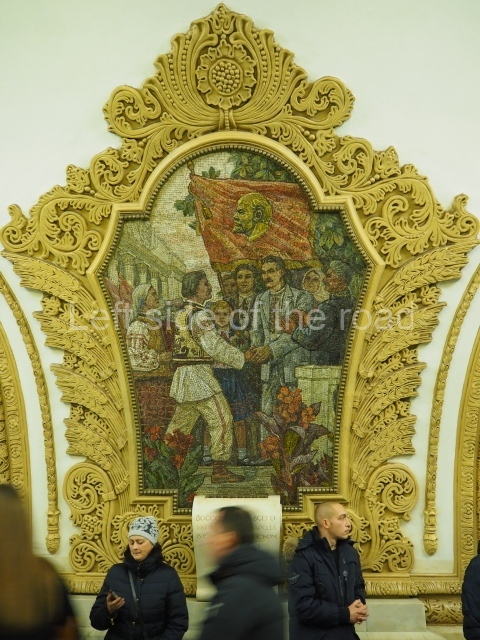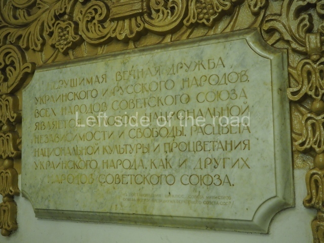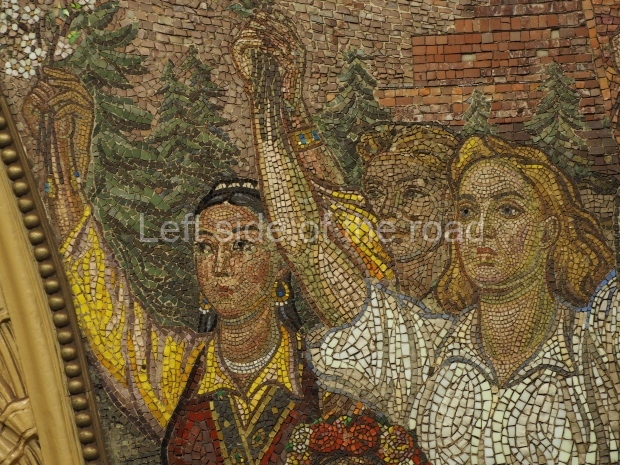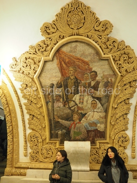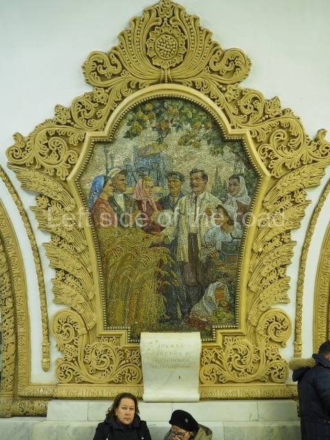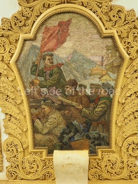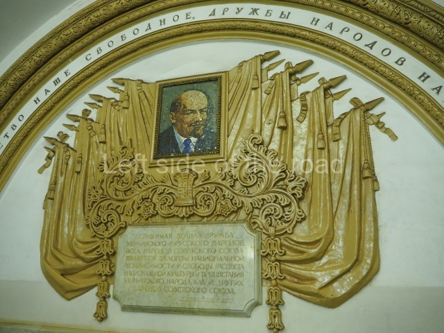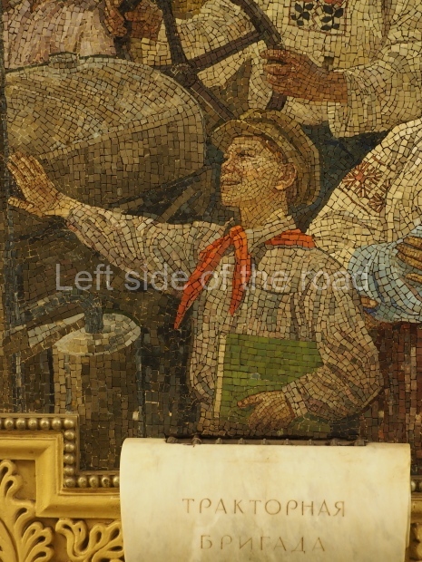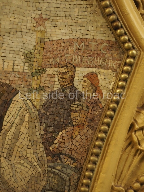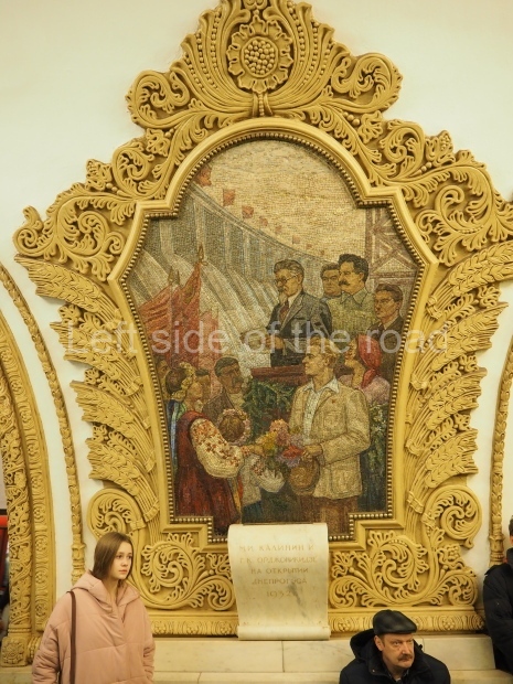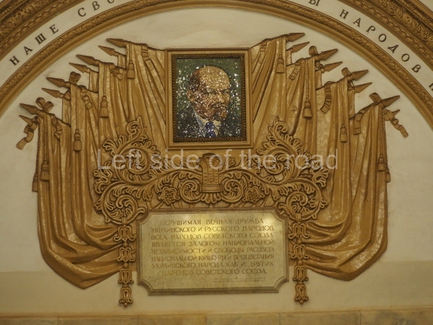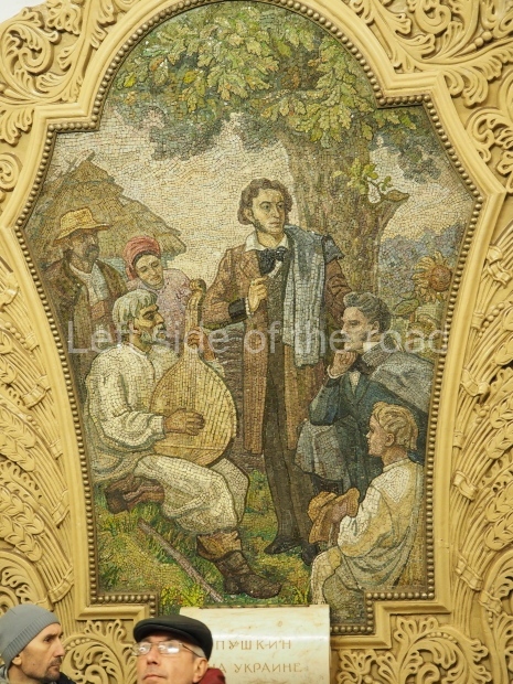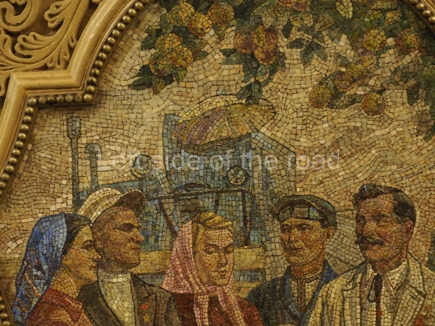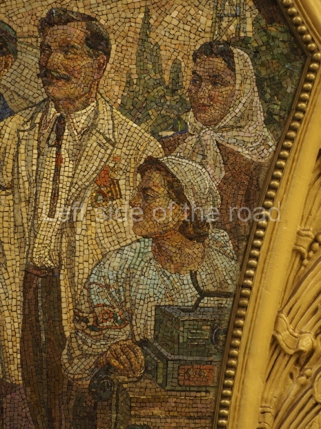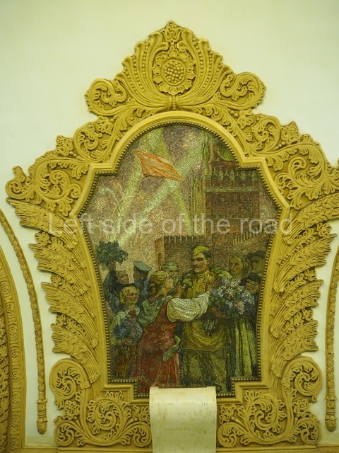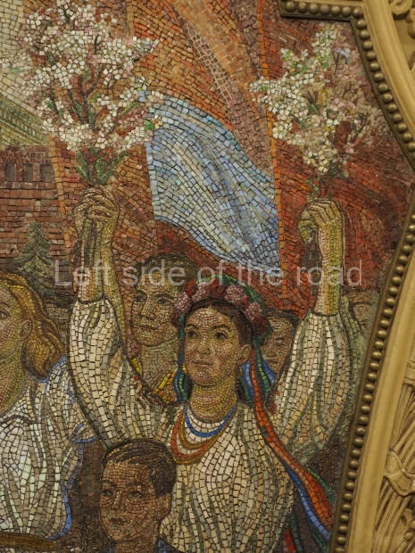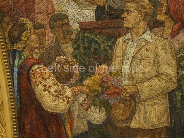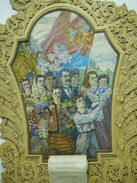 Kievskaya is a cheerful, lively, and some vulgar station. It is decorated with a lot of gilt. Massive cubic pylons with oblique angles and slightly upper opening capitals are decorated by broad ceramic friezes, claret-coloured with gold. There are 12 pair frescoes in intricate frames on each pylon on the side of the distribution hall, which tell about the happy life in the Soviet Ukraine. If going from the eastern end of the station (passageway to the Circle Line), the first fresco on the left side is ‘Trio of Bandorist Girls’, the opposite – ‘Girls Embroidering a Portrait of T. Shevchenko’. Then – ‘Students’ / ‘Ceramist Girls’, ‘Fishermen on the Azov’ (pay attention to Azov sturgeon, which is just extinct from the Earth) / ‘Foreman on a Building Site’, ‘Cotton-growers’ (cotton plant has failed to get acclimatised in the Ukraine) / ‘Steel Makers’, ‘Apple-gathering’ / ‘Harvestings’ [sic] ‘Vegetable-gathering ‘ (the sizes of cabbage and pumpkins strike) / ‘Welcoming Miners with Flowers’, ‘Kindergarten ‘/ ‘Bricklayers’, Ukrainian Dance’/ ‘Welcoming an Officer’, ‘Grain-selectionist ‘ / ‘Vegetable-selectionist’, ‘Veterinary and Cattle-breeders ‘ / ‘Wine-makers’, Chemistry Scientists’ / ‘Veteran and Students of a Vocational School’, ‘Decorating Champions / ‘Engineering Workers’.