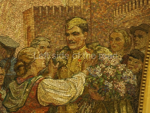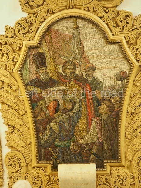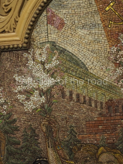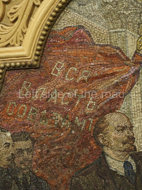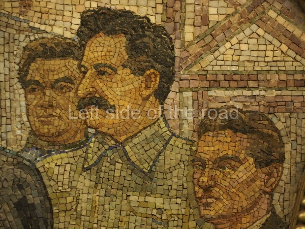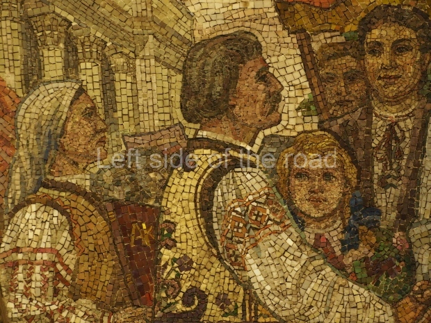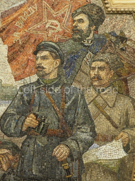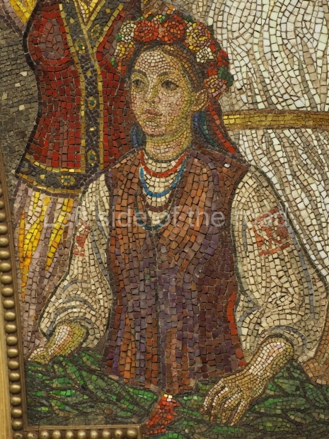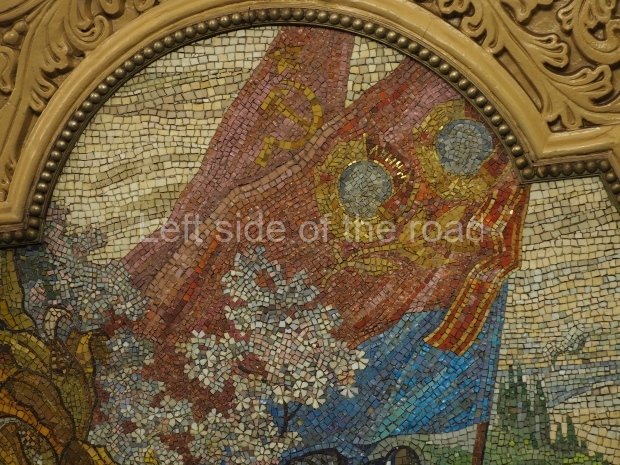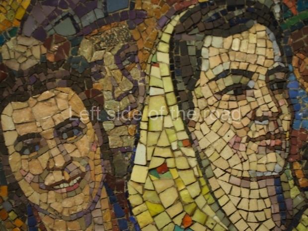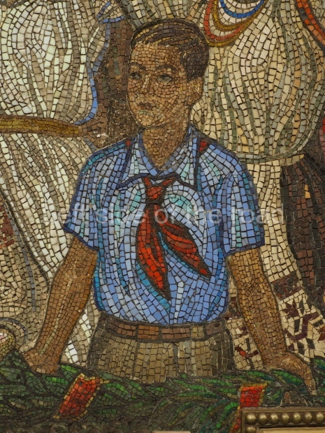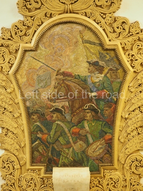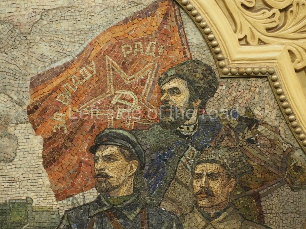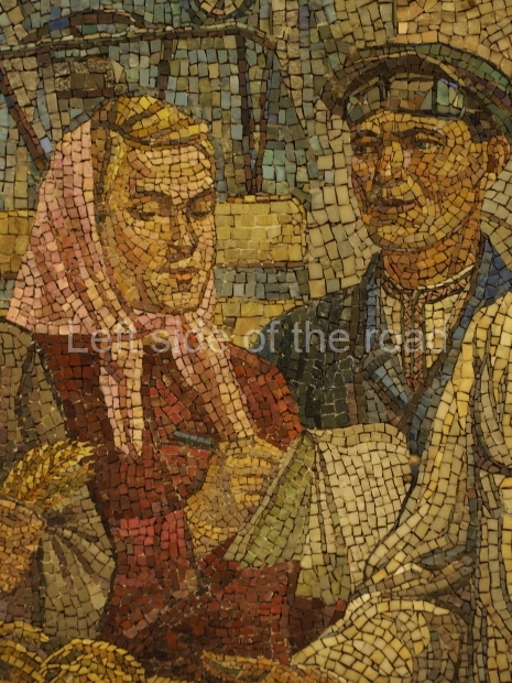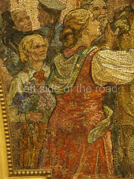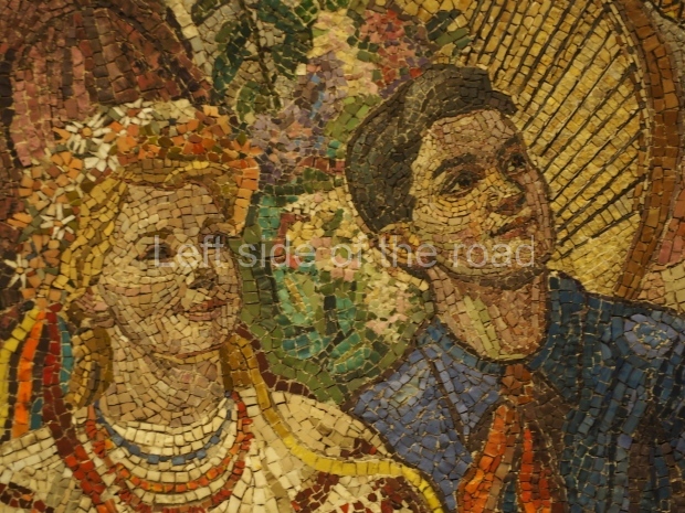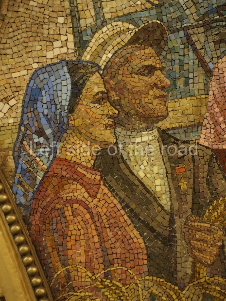 Kievskaya is a cheerful, lively, and some vulgar station. It is decorated with a lot of gilt. Massive cubic pylons with oblique angles and slightly upper opening capitals are decorated by broad ceramic friezes, claret-coloured with gold. There are 12 pair frescoes in intricate frames on each pylon on the side of the distribution hall, which tell about the happy life in the Soviet Ukraine. If going from the eastern end of the station (passageway to the Circle Line), the first fresco on the left side is ‘Trio of Bandorist Girls’, the opposite – ‘Girls Embroidering a Portrait of T. Shevchenko’. Then – ‘Students’ / ‘Ceramist Girls’, ‘Fishermen on the Azov’ (pay attention to Azov sturgeon, which is just extinct from the Earth) / ‘Foreman on a Building Site’, ‘Cotton-growers’ (cotton plant has failed to get acclimatised in the Ukraine) / ‘Steel Makers’, ‘Apple-gathering’ / ‘Harvestings’ [sic] ‘Vegetable-gathering ‘ (the sizes of cabbage and pumpkins strike) / ‘Welcoming Miners with Flowers’, ‘Kindergarten ‘/ ‘Bricklayers’, Ukrainian Dance’/ ‘Welcoming an Officer’, ‘Grain-selectionist ‘ / ‘Vegetable-selectionist’, ‘Veterinary and Cattle-breeders ‘ / ‘Wine-makers’, Chemistry Scientists’ / ‘Veteran and Students of a Vocational School’, ‘Decorating Champions / ‘Engineering Workers’.