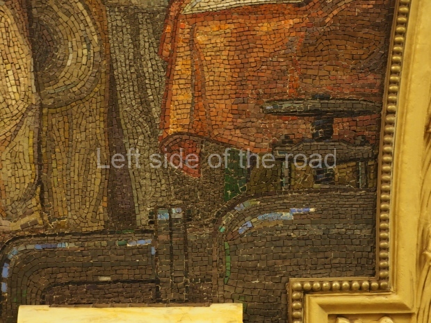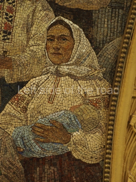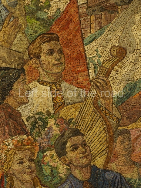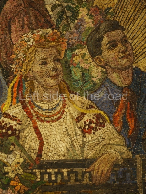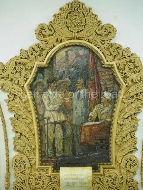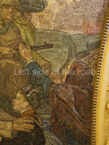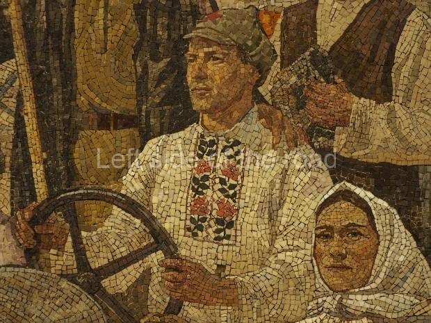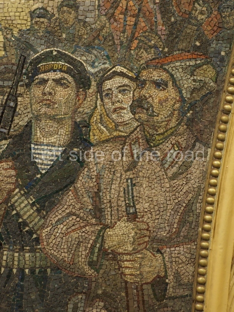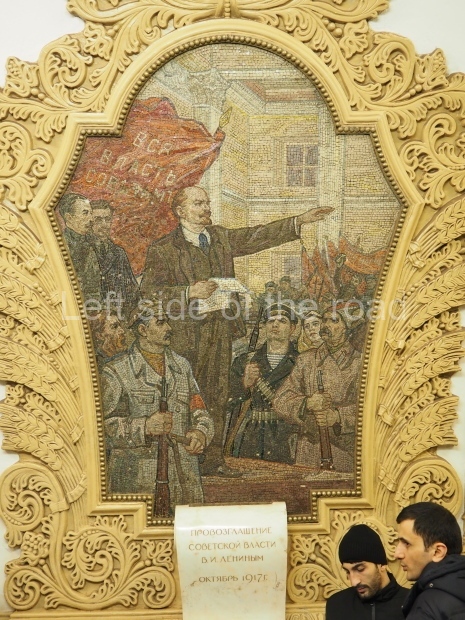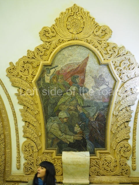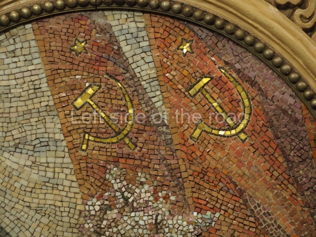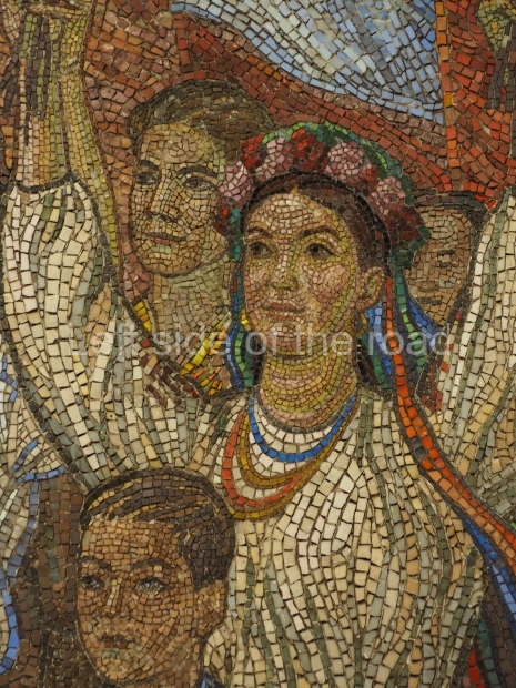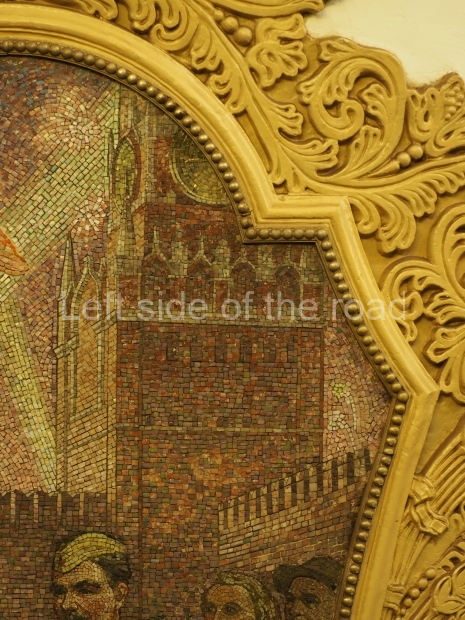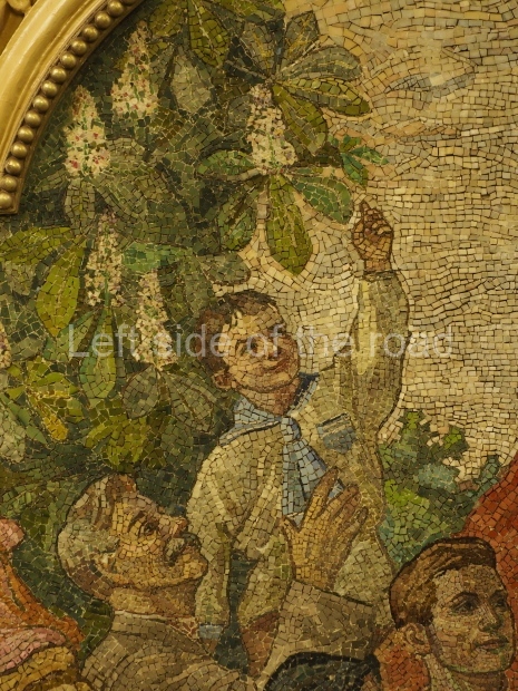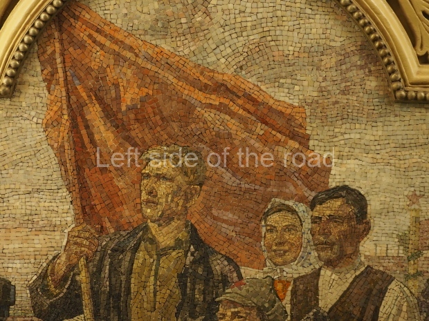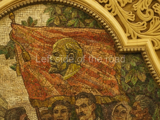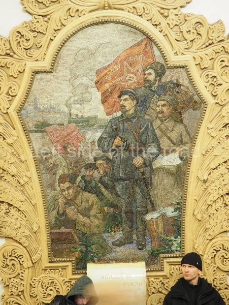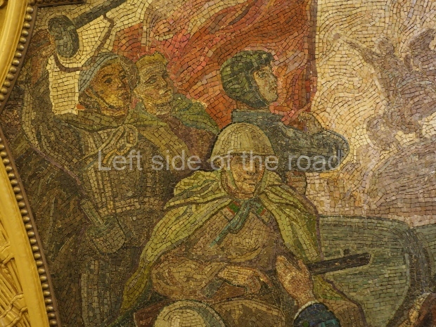 Kievskaya is a cheerful, lively, and some vulgar station. It is decorated with a lot of gilt. Massive cubic pylons with oblique angles and slightly upper opening capitals are decorated by broad ceramic friezes, claret-coloured with gold. There are 12 pair frescoes in intricate frames on each pylon on the side of the distribution hall, which tell about the happy life in the Soviet Ukraine. If going from the eastern end of the station (passageway to the Circle Line), the first fresco on the left side is ‘Trio of Bandorist Girls’, the opposite – ‘Girls Embroidering a Portrait of T. Shevchenko’. Then – ‘Students’ / ‘Ceramist Girls’, ‘Fishermen on the Azov’ (pay attention to Azov sturgeon, which is just extinct from the Earth) / ‘Foreman on a Building Site’, ‘Cotton-growers’ (cotton plant has failed to get acclimatised in the Ukraine) / ‘Steel Makers’, ‘Apple-gathering’ / ‘Harvestings’ [sic] ‘Vegetable-gathering ‘ (the sizes of cabbage and pumpkins strike) / ‘Welcoming Miners with Flowers’, ‘Kindergarten ‘/ ‘Bricklayers’, Ukrainian Dance’/ ‘Welcoming an Officer’, ‘Grain-selectionist ‘ / ‘Vegetable-selectionist’, ‘Veterinary and Cattle-breeders ‘ / ‘Wine-makers’, Chemistry Scientists’ / ‘Veteran and Students of a Vocational School’, ‘Decorating Champions / ‘Engineering Workers’.