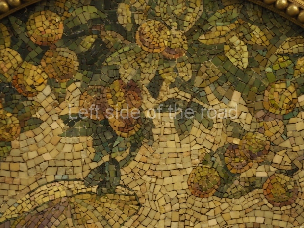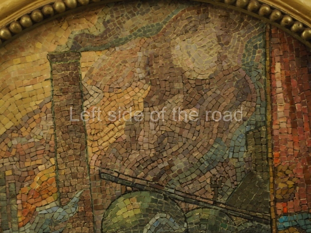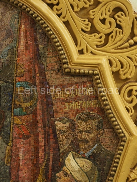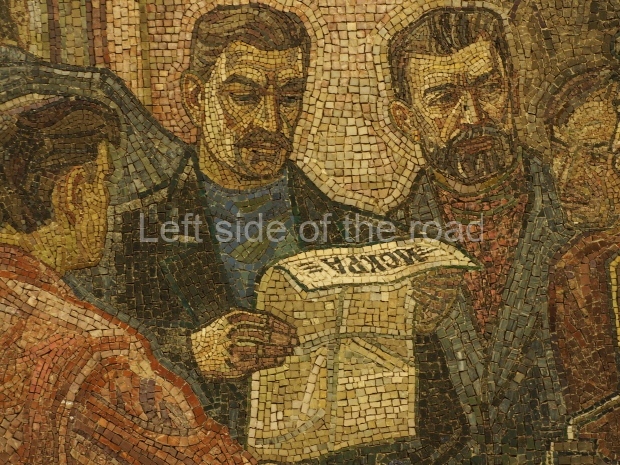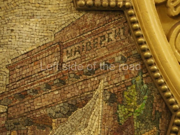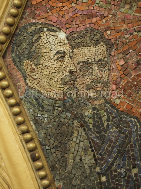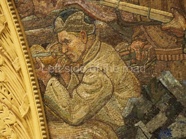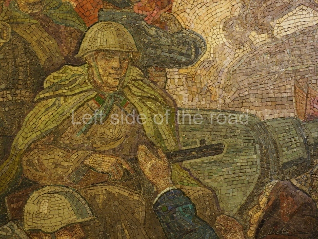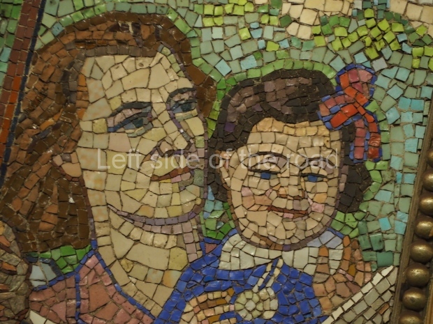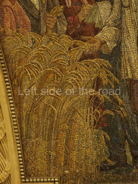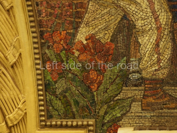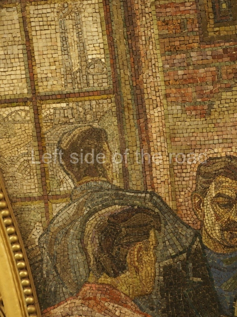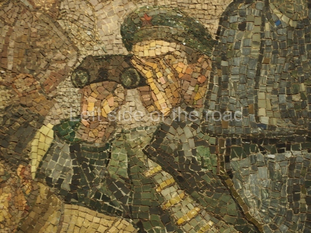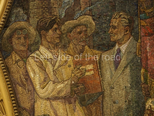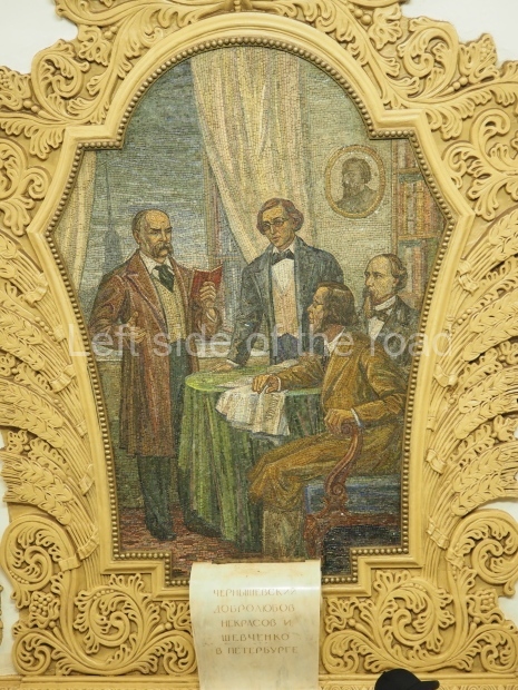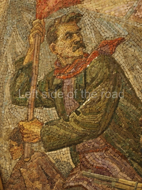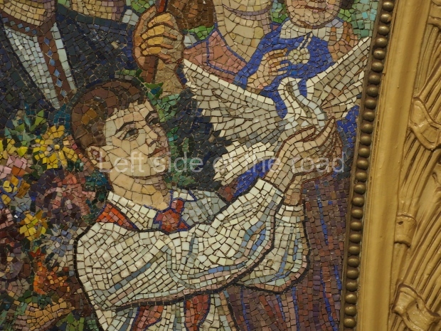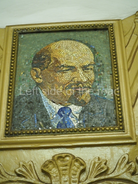 Kievskaya is a cheerful, lively, and some vulgar station. It is decorated with a lot of gilt. Massive cubic pylons with oblique angles and slightly upper opening capitals are decorated by broad ceramic friezes, claret-coloured with gold. There are 12 pair frescoes in intricate frames on each pylon on the side of the distribution hall, which tell about the happy life in the Soviet Ukraine. If going from the eastern end of the station (passageway to the Circle Line), the first fresco on the left side is ‘Trio of Bandorist Girls’, the opposite – ‘Girls Embroidering a Portrait of T. Shevchenko’. Then – ‘Students’ / ‘Ceramist Girls’, ‘Fishermen on the Azov’ (pay attention to Azov sturgeon, which is just extinct from the Earth) / ‘Foreman on a Building Site’, ‘Cotton-growers’ (cotton plant has failed to get acclimatised in the Ukraine) / ‘Steel Makers’, ‘Apple-gathering’ / ‘Harvestings’ [sic] ‘Vegetable-gathering ‘ (the sizes of cabbage and pumpkins strike) / ‘Welcoming Miners with Flowers’, ‘Kindergarten ‘/ ‘Bricklayers’, Ukrainian Dance’/ ‘Welcoming an Officer’, ‘Grain-selectionist ‘ / ‘Vegetable-selectionist’, ‘Veterinary and Cattle-breeders ‘ / ‘Wine-makers’, Chemistry Scientists’ / ‘Veteran and Students of a Vocational School’, ‘Decorating Champions / ‘Engineering Workers’.