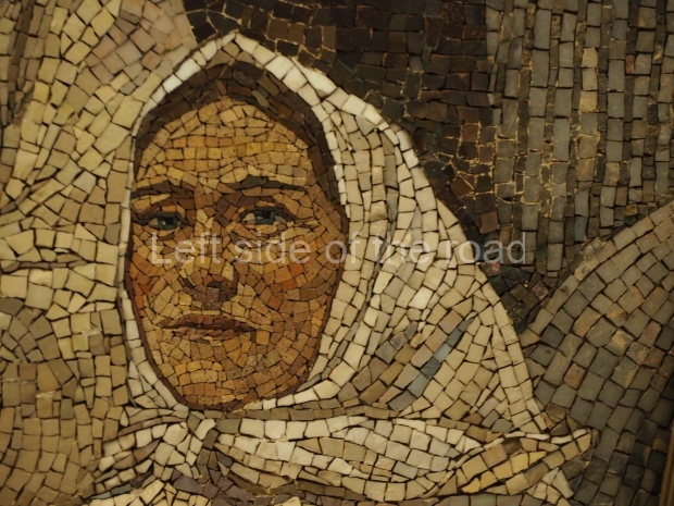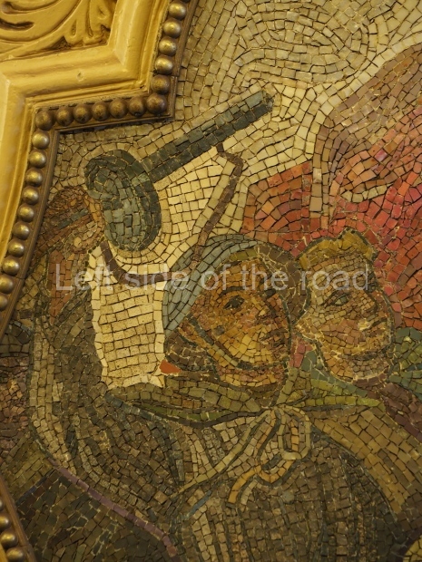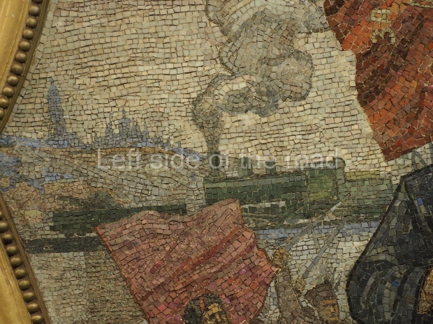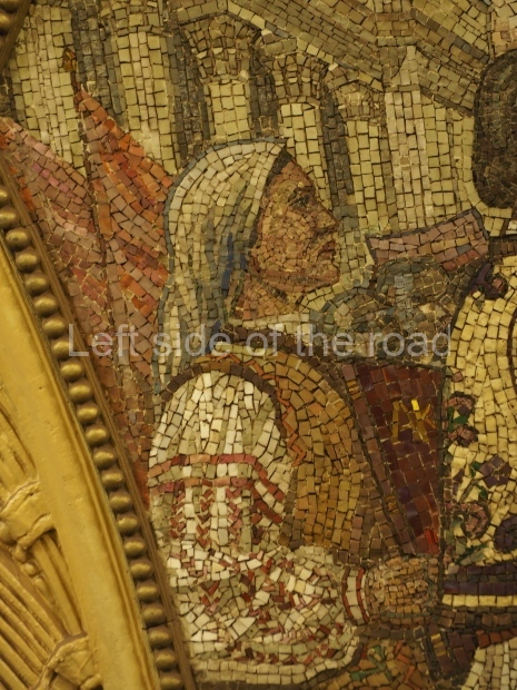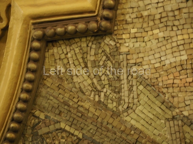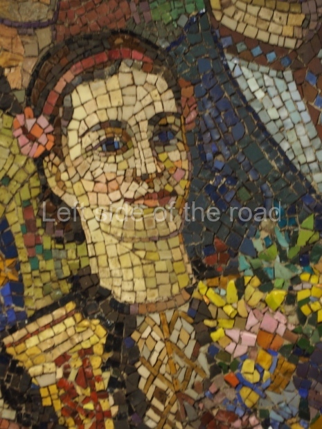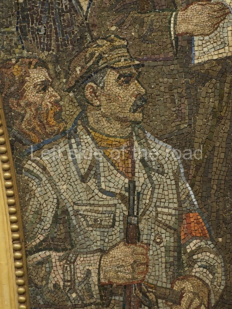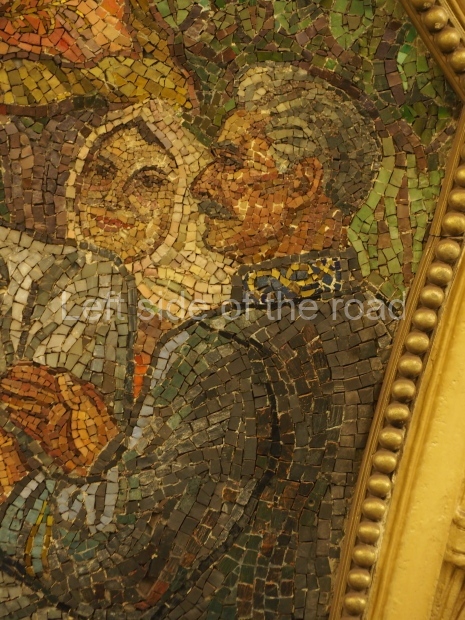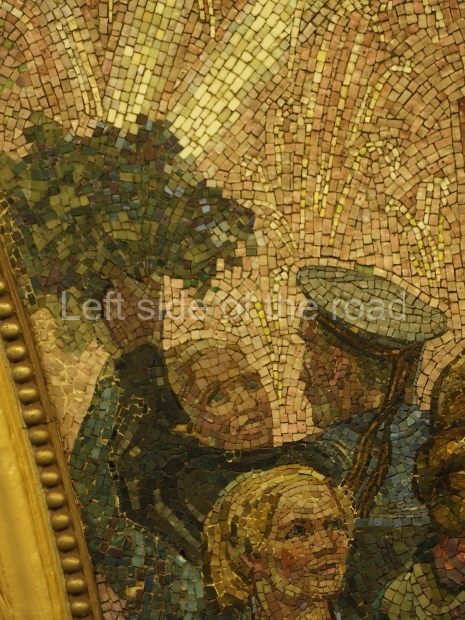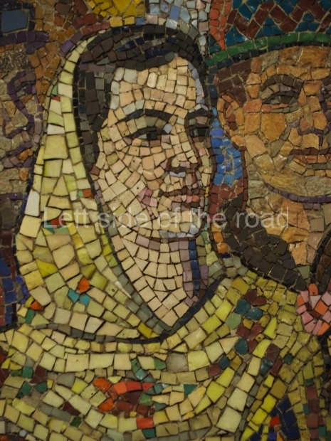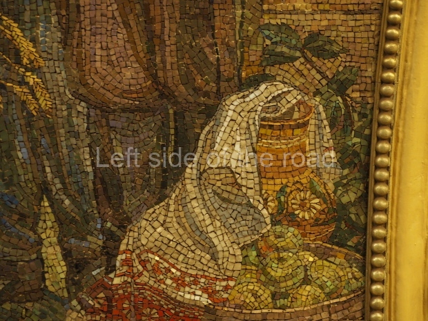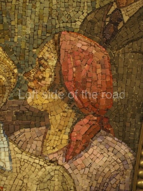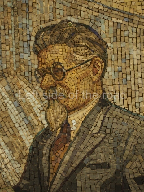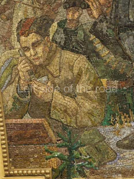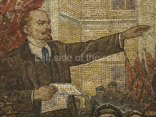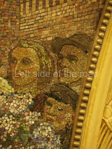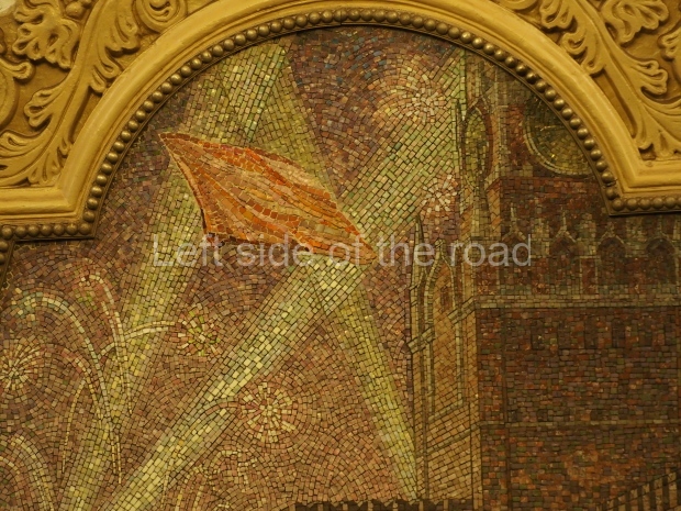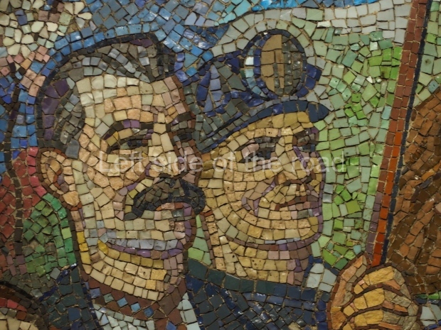 Kievskaya is a cheerful, lively, and some vulgar station. It is decorated with a lot of gilt. Massive cubic pylons with oblique angles and slightly upper opening capitals are decorated by broad ceramic friezes, claret-coloured with gold. There are 12 pair frescoes in intricate frames on each pylon on the side of the distribution hall, which tell about the happy life in the Soviet Ukraine. If going from the eastern end of the station (passageway to the Circle Line), the first fresco on the left side is ‘Trio of Bandorist Girls’, the opposite – ‘Girls Embroidering a Portrait of T. Shevchenko’. Then – ‘Students’ / ‘Ceramist Girls’, ‘Fishermen on the Azov’ (pay attention to Azov sturgeon, which is just extinct from the Earth) / ‘Foreman on a Building Site’, ‘Cotton-growers’ (cotton plant has failed to get acclimatised in the Ukraine) / ‘Steel Makers’, ‘Apple-gathering’ / ‘Harvestings’ [sic] ‘Vegetable-gathering ‘ (the sizes of cabbage and pumpkins strike) / ‘Welcoming Miners with Flowers’, ‘Kindergarten ‘/ ‘Bricklayers’, Ukrainian Dance’/ ‘Welcoming an Officer’, ‘Grain-selectionist ‘ / ‘Vegetable-selectionist’, ‘Veterinary and Cattle-breeders ‘ / ‘Wine-makers’, Chemistry Scientists’ / ‘Veteran and Students of a Vocational School’, ‘Decorating Champions / ‘Engineering Workers’.