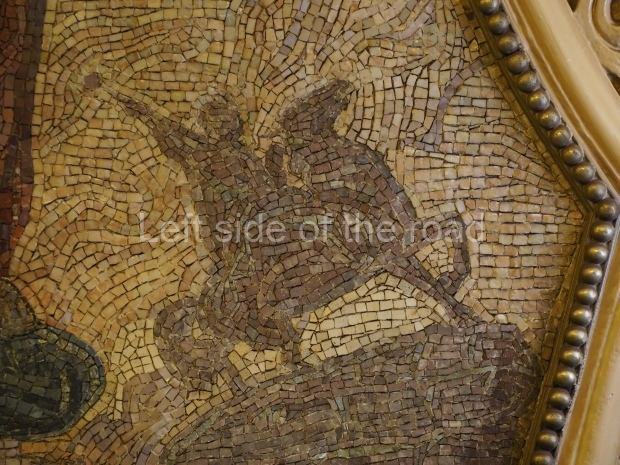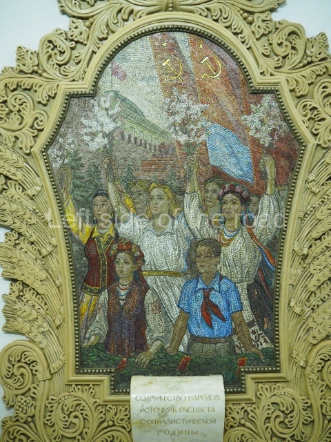 which ends at the same intermediate escalator hall but on the other side. The semi-circular hip-roof escalator hall is decorated like Kievskaya station of the Arbatsko-Pokrovskaya Line. It is decorated with a white marble colonnade of eight columns of the Ionic order. There is a wide mosaic frieze – ‘Donations to the Coat of Arms of the Soviet Ukraine’ – on the wall lower the vault. Coat of Arms of the Soviet Ukraine is located over the arc of exit, opposite the escalator tunnel. From the left and right sides of it, Ukrainian smiths, reapers, engineering workers, children, pioneers, miners, gardeners, cattle-breeders, and engineers present things they made to the coat of arms. The figures of donors are designed in an Egyptian style. The composition itself shows whose portrait was at the place of the coat of arms earlier. The walls of the corridor which surrounds the hall are faced with very decorated onyx with intricately alternate white, grey, brown, and purple stripes.