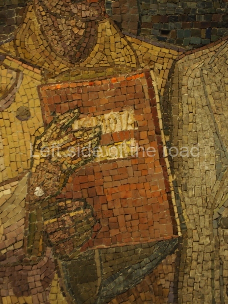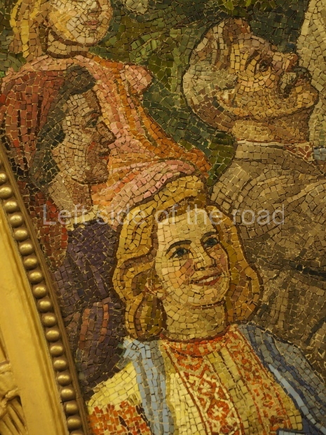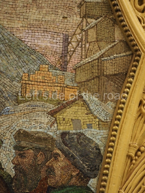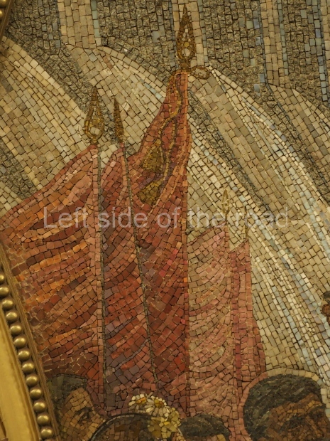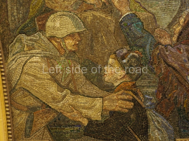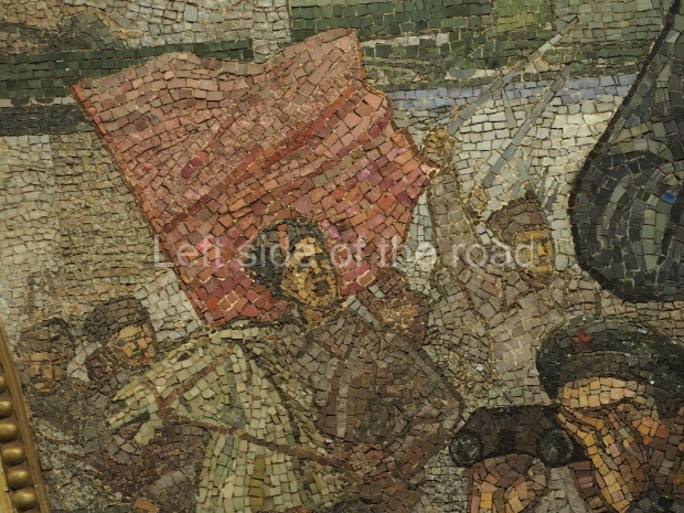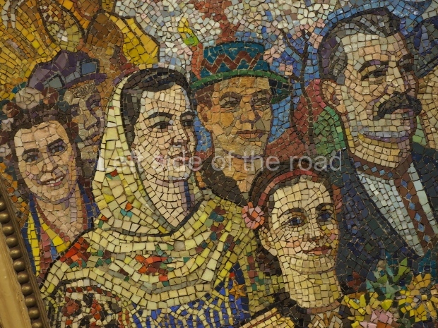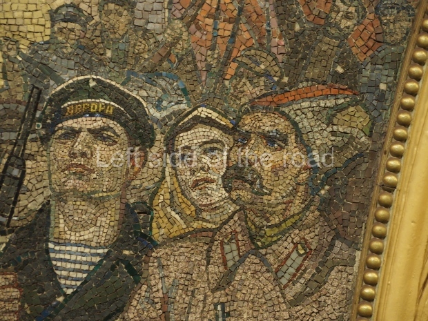 The gallery is crowned by a fresco, which occupies the whole west blank end of the station – ‘People Festivity in Kiev’. It shows joyful women in outstanding folk dresses and exultant children. There are also a monument of B. Khmelnitsky, newly erected buildings, and golden domes of the monastery. Cheerful crowd follows dancing girls who look at one place, but there is nothing. It is interesting that the sky at almost all the frescoes, including the central one, is golden, not blue.