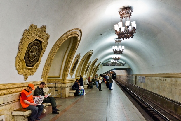 Kiyevskaya (Киевская), named for the nearby Kiyevsky railway station, is a station on the Arbatsko–Pokrovskaya line of the Moscow Metro. Opened in 1953, it is lavishly decorated in the quasi-baroque style that predominated in the early 1950s. The square pylons are faced with white Ural marble and elaborately patterned ceramic tile and the plastered ceiling is decorated with a series of frescoes by various artists depicting life in Ukraine. A large mosaic at the end of the platform commemorates the 300th anniversary of the reunification of Russia and Ukraine. Light comes from a row of hexagonal chandeliers. The architects were L. V. Lile, V. A. Litvinov, M. F. Markovsky, and V. M. Dobrokovsky.