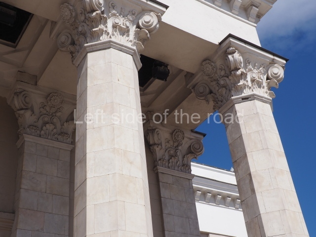 Beginning with the large vestibule located among the former of the two train stations, the building features a large octagonal dome topped by a cupola, and a spire crowned by a large star and imposing full-height portico with stylised Corinthian columns. Inside amid the Baroque-style ornaments, rich torchères and chandelier lights, two escalators descend, one leading to the old 1935 Komsomolskaya-Radialnaya station, and the second to this one.