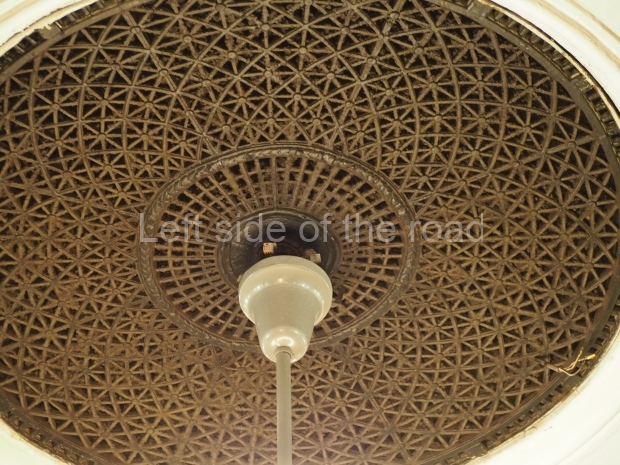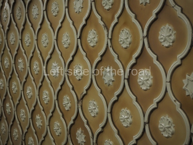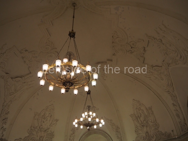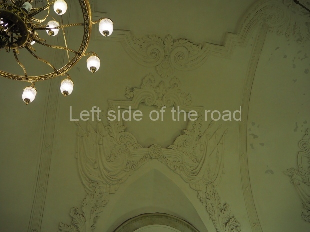 On the platform level, there is a Baroque ceiling, with accompanying friezes, painted yellow. Supporting the enlarged barrel vault are 68 octagonal columns faced with white marble, and topped with baroque pilasters. The platform is lit up by chandeliers and additional concealed elements in the niches of both the central and platform halls.