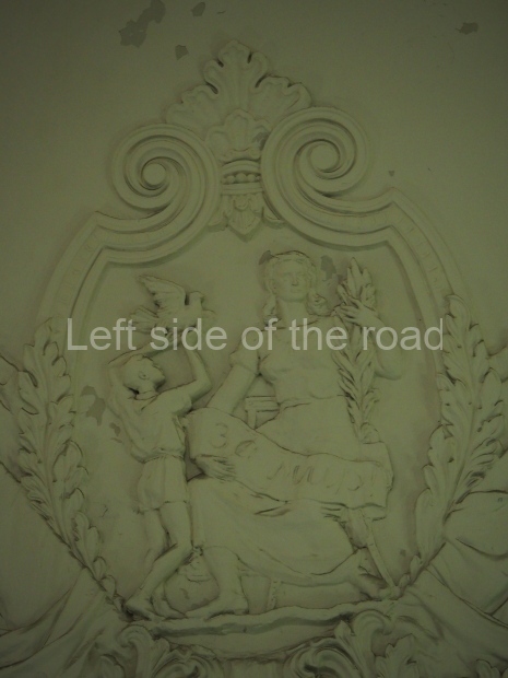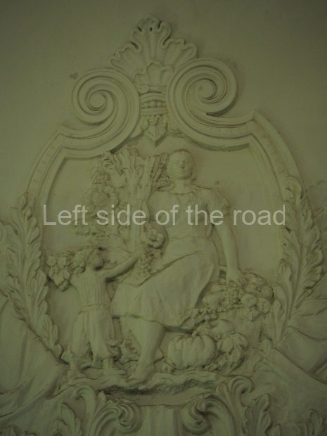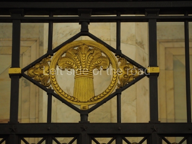 A barefooted lady with an olive branch in her left hand and sickle and hammer in her right hand tramples on fascist banners thrown to the basement of the mausoleum. All the panels are set off with wide mouldings inspired by Russian mansion ‘grass’ painting. The similar moulding forms separate geometrical shapes, such as belts, frames, and edgings.