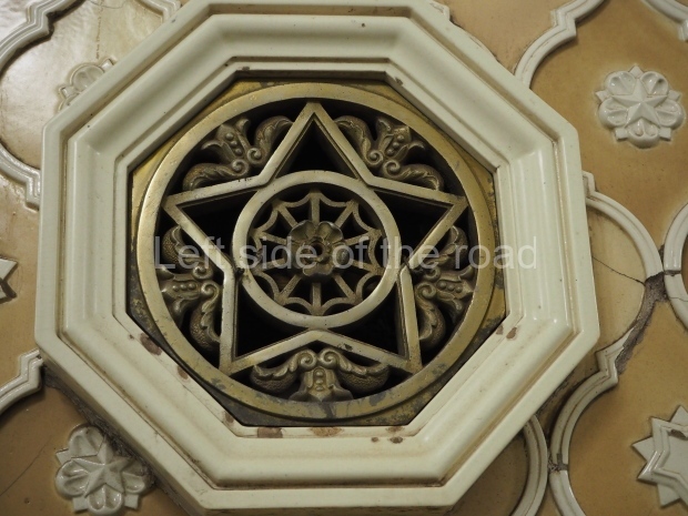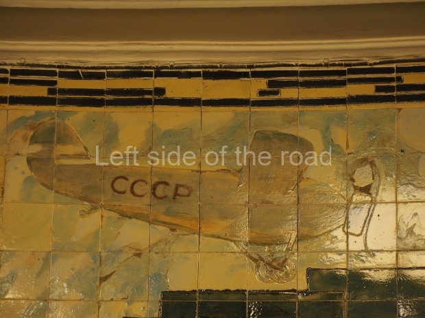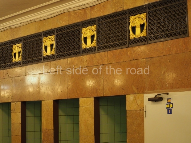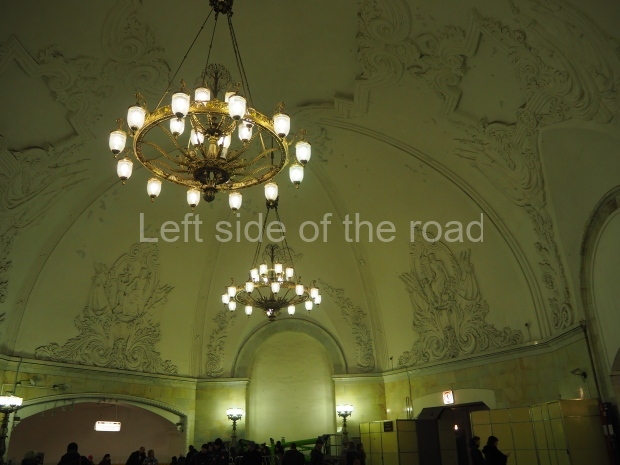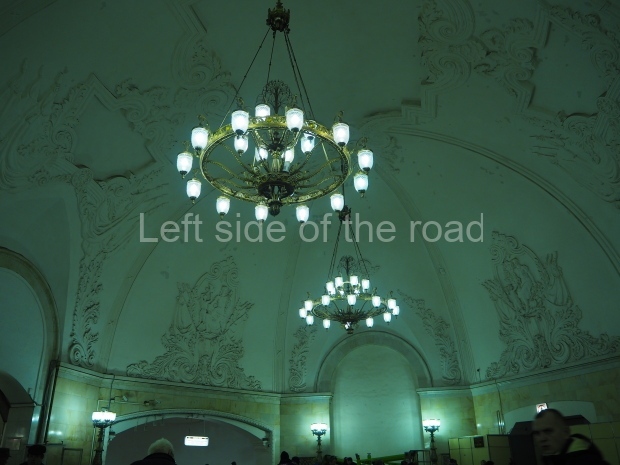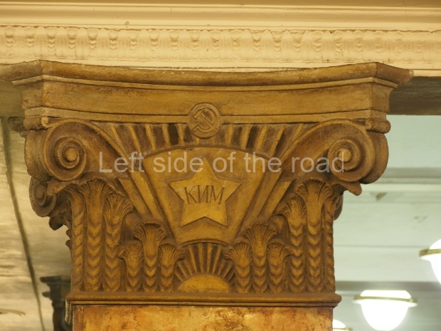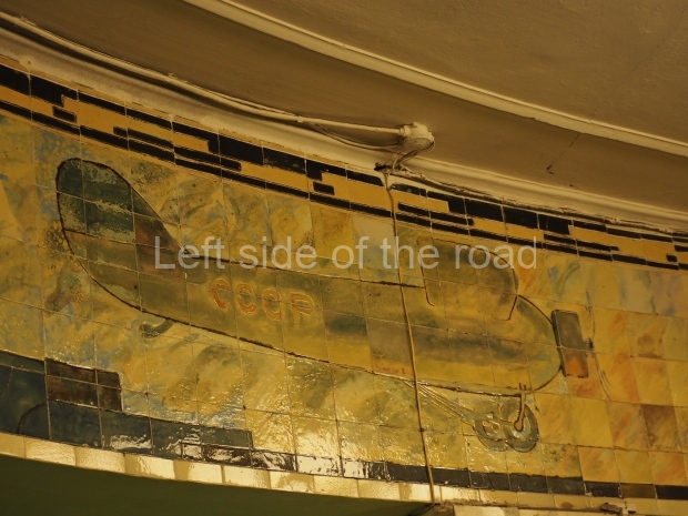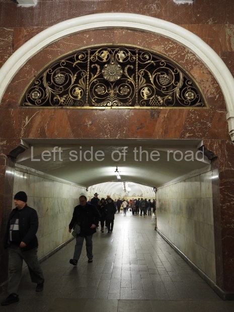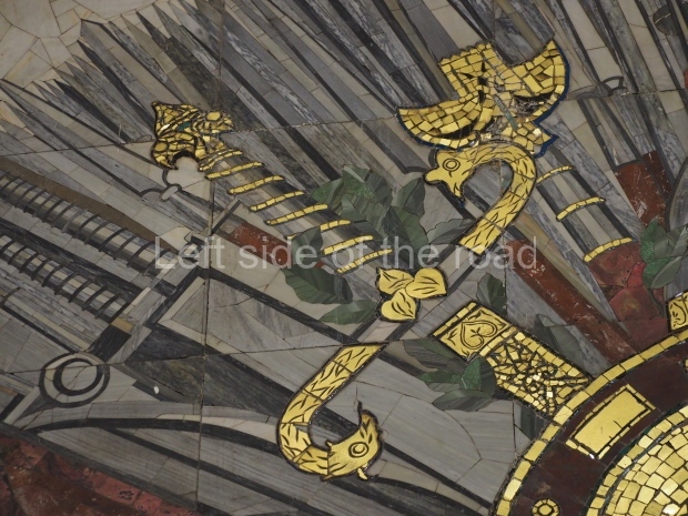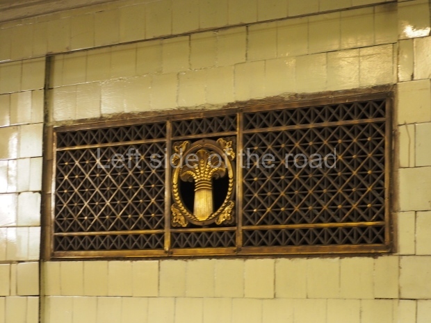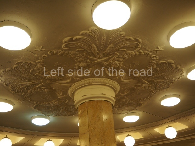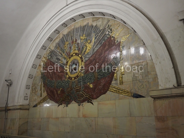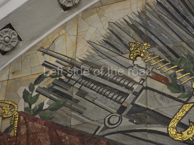 In the centre of the red granite covered platform are two passageways, surrounded by marble balustrades with escalators that descend into a lobby with a main escalator tunnel upwards to the Sokolnicheskaya line’s Komsomolskaya station. On the wall opposite the escalator is a large fluorescent mosaic, also of Pavel Korin, depicting the Order of Victory surrounded by red and green banners and Georgian colours.