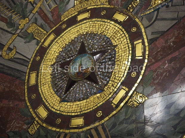 In between each of the main mosaics there are smaller ones made of gilded smalt depicting various weaponry and armour. One set is focused on ancient Russian equipment, a second on the Napoleonic era, and the third on World War II. At the end of the platform is a bust of Vladimir Lenin under an arch decorated with gilt floral designs and the Coat of arms of the Soviet Union.
