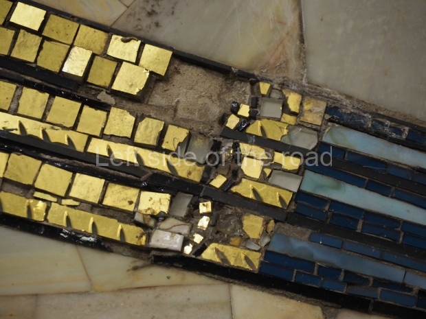 There are eight smalt mosaics along the main axis of the central hall and 16 more golden mosaics in pseudo-pendentives highlighted with mouldings. The mosaic panels are located in a chronological order starting from the blind end of Komsomolskaya. The end wall of the station carries a mosaic coat of arms of the USSR, gold on the claret-coloured background rounded with florid ornament. A small marble bust of V. Lenin is beneath the coat of arms.