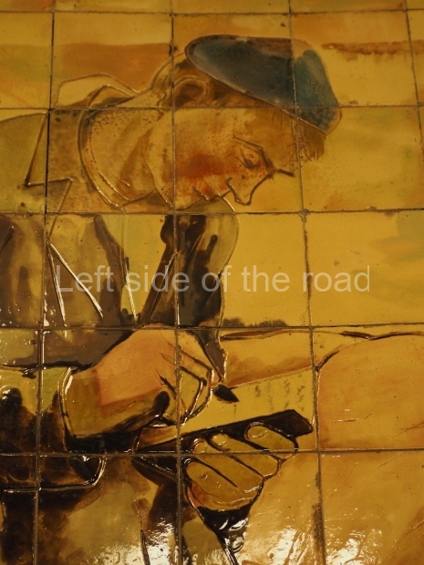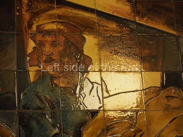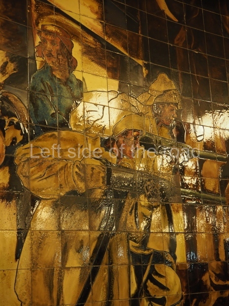 1945: The original image was of a Victory parade with Soviet soldiers throwing captured Nazi banners in front of Lenin’s mausoleum. However, for the same reason as the sixth image, this image was retouched on several occasions. When Lavrenty Beria was arrested in 1953, his glasses were erased and then the whole figure was removed. Then in 1957, after the political crisis saw the end of the careers of Vyacheslav Molotov and Lazar Kaganovich, their images followed suit. Finally, after 1961 brought the end of Stalin’s personality cult, in early 1963 the whole panel was taken down, and Korin redesigned it by placing a maiden (symbolising Mother Russia) standing on the Nazi banners in front of the same mausoleum, holding a hammer and sickle in one hand and a palm branch in the other. This mosaic is made of more than 300,000 tiles, takes up 31.5 square metres (339 sq ft) and weighs more than three tonnes.