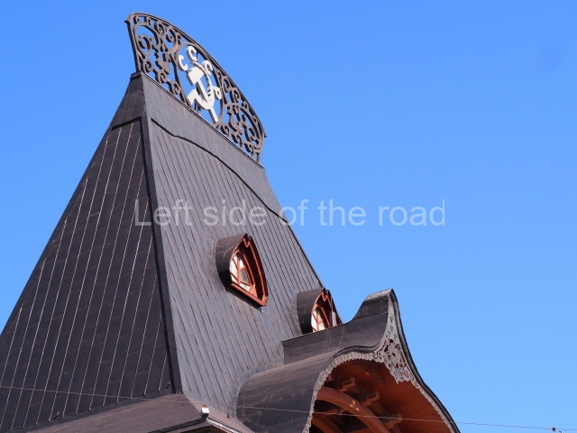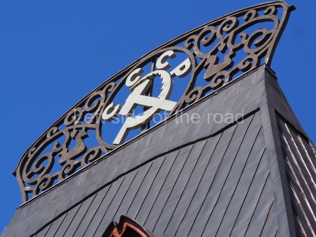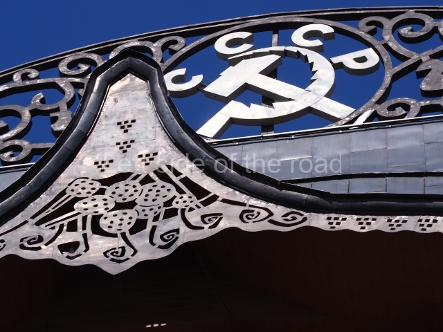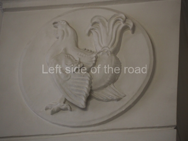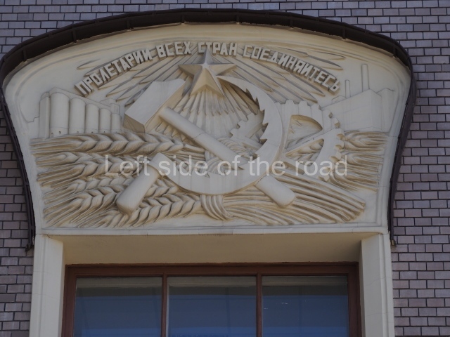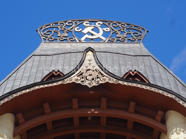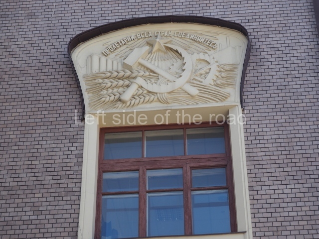 In the centre of the ridge crest on top of the very steep hip roof, immediately above the principal entrance, there used to be a double-headed eagle – the symbol of the imperial court. This has been replaced by a hammer and sickle (the symbol of the Soviet Union) with the letters ‘CCCP’ for Союз Советских Социалистических Республик, Union of Soviet Socialist Republics (USSR).