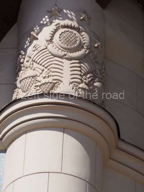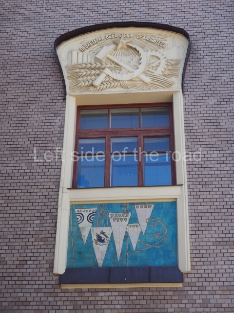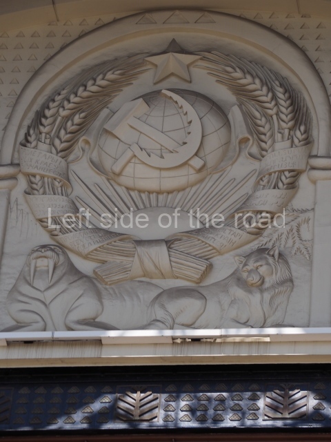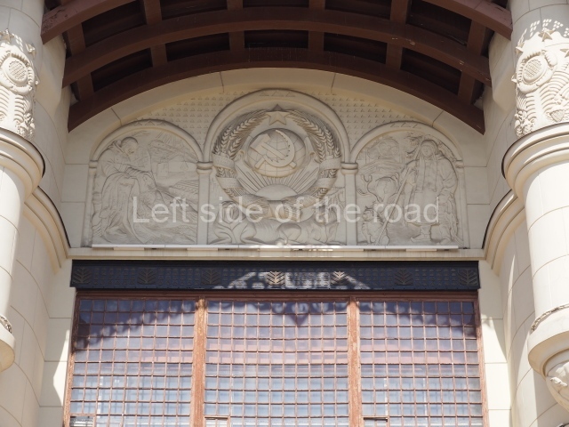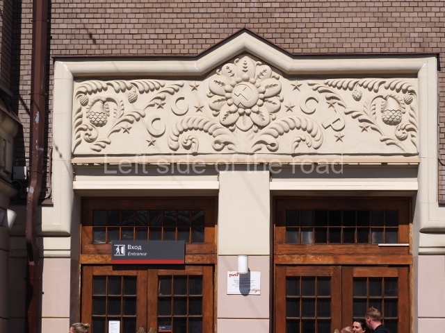 Having not seen a comprehensive photographic record of what the building looked like prior to 1917 it is not possible to say if certain modernist decoration might have been removed to allow for that favoured under the artistic influence of Socialist Realism. Also, I’m not aware of the level of damage that might have been caused by the Nazi invasion of the Great Patriotic War and the level of reconstruction that might have been needed following the victory over German fascism. Such reconstruction would have made it easier to choose between restoration of the original decoration of the 1910s and the creation of new decorative panels which included Soviet imagery.