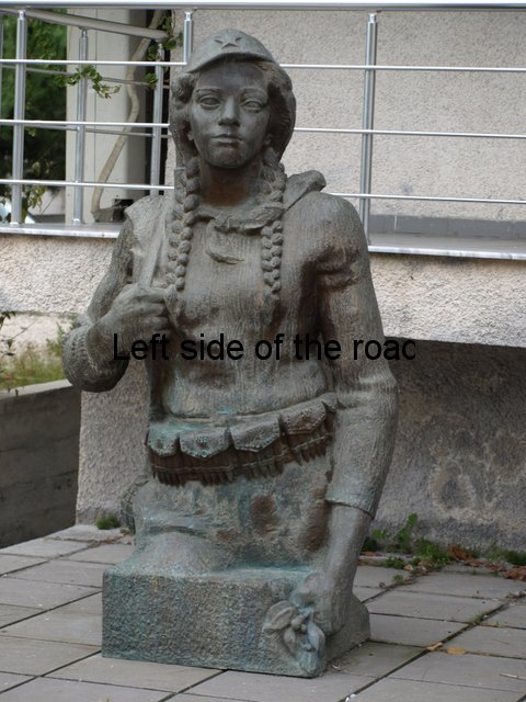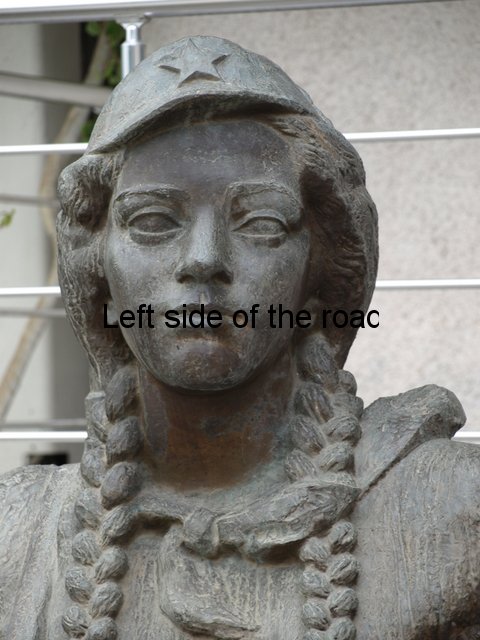 The statue is slightly larger than life-size but we only have her depicted from the thighs up. She is shown dressed as a Partisan fighter, not in full uniform as such but in a manner that allows no doubt that she is a full-time member of the fighting force. The pose is as if she were standing to attention and she presents a calm demeanour, serene and confident and clear about what she is doing. She wears a cap with the star of a Communist clear at the front.