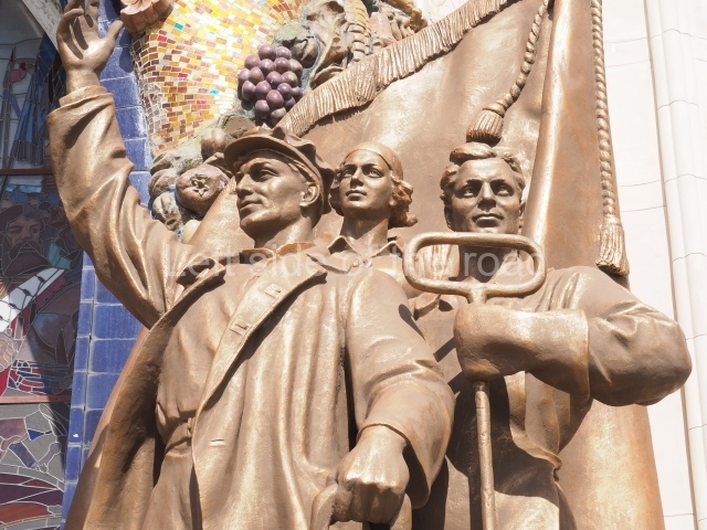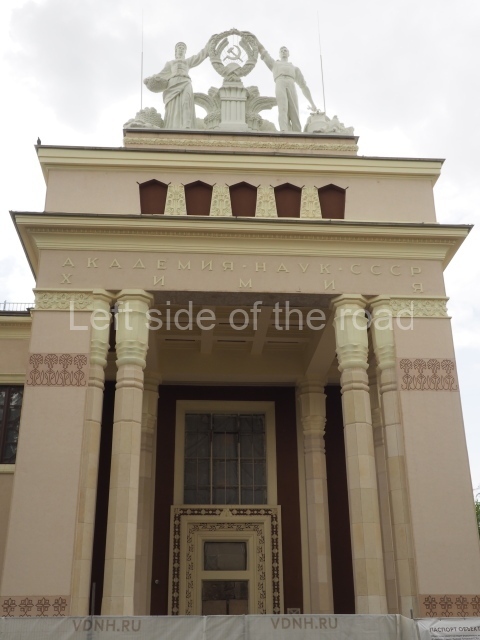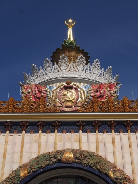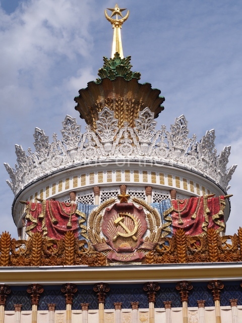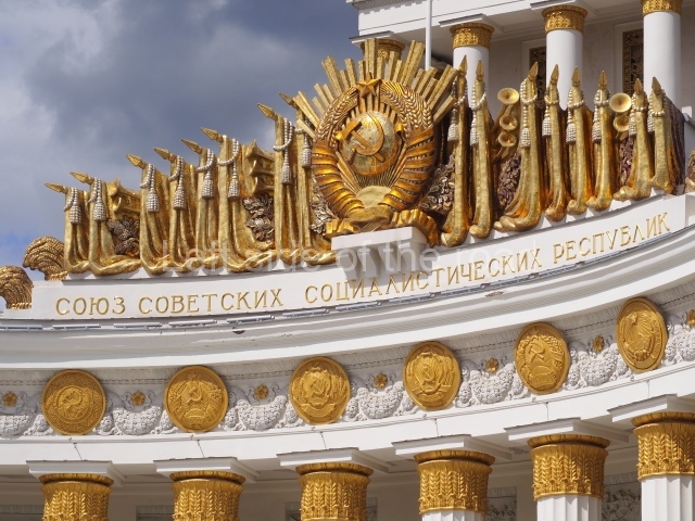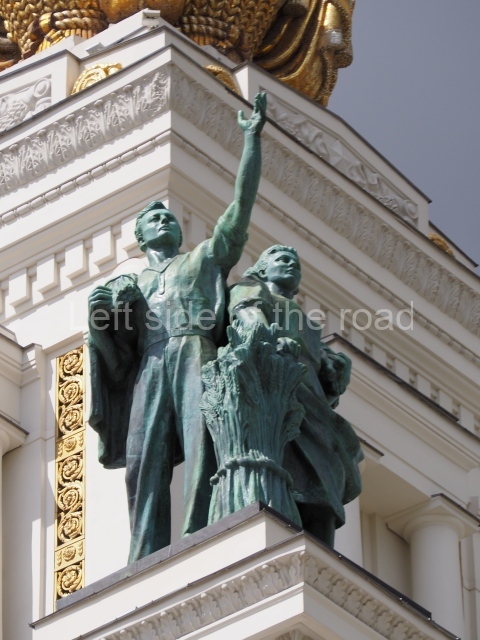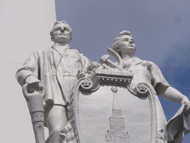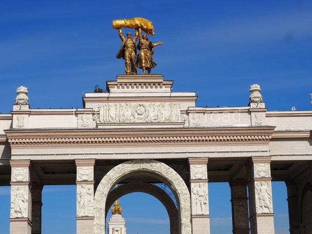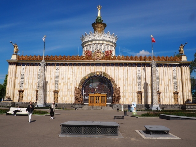 During Soviet times, each year VDNKh hosted more than 300 national and international exhibitions and many conferences, seminars and meetings of scientists and industry professionals. The most memorable feature of the exhibition site was the Worker and Kolkhoz Woman (Rabochiy i kolkhoznitsa) statue, featuring the gigantic figures of a man and woman holding together the ‘hammer and sickle’. The sculpture, which reaches 25 meters toward the sky, was designed by Vera Mukhina and originally crowned the 35-meter-tall Soviet pavilion at the Paris Exposition Internationale des Arts et Techniques dans la Vie Moderne (1937).