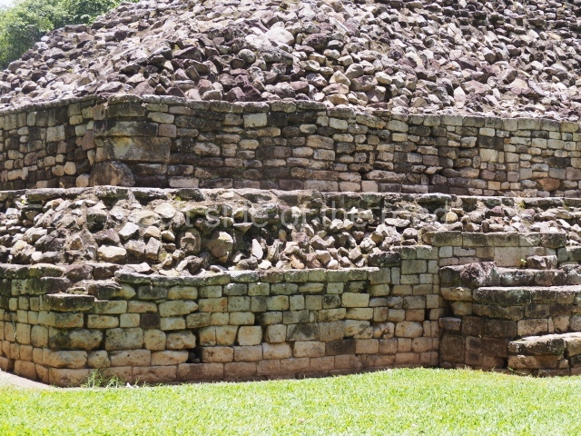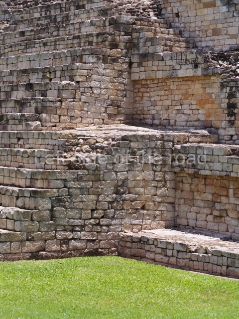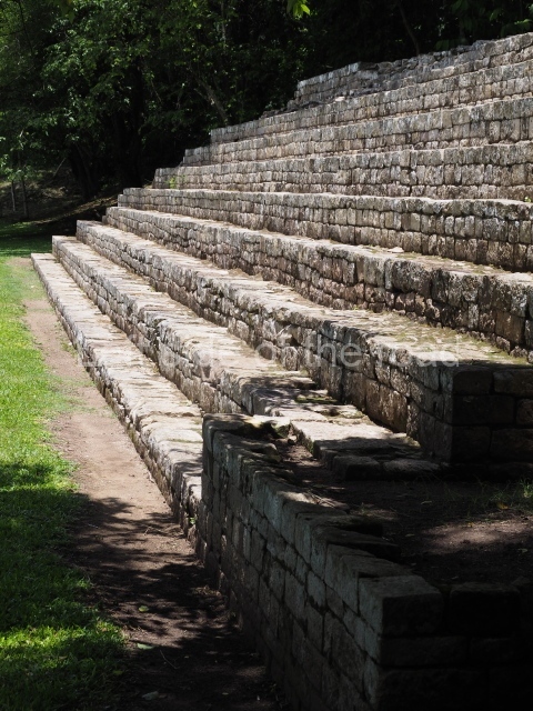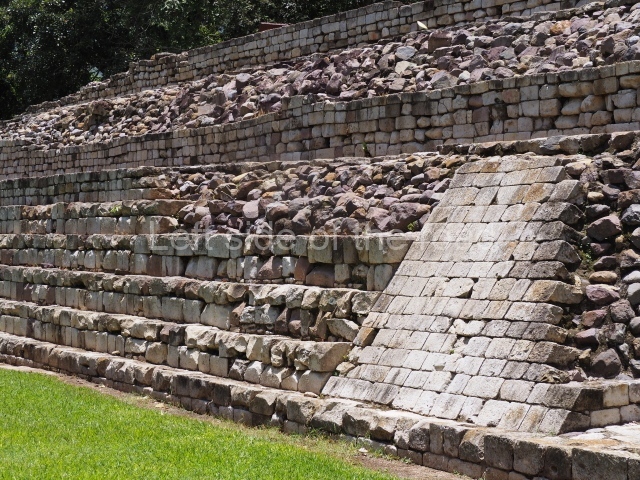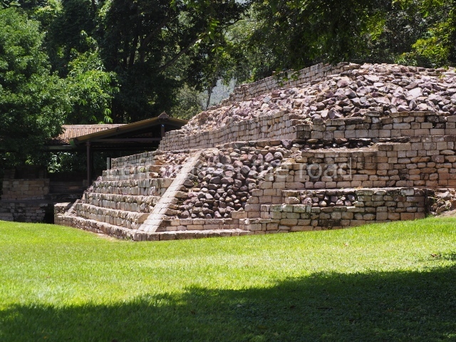 The structure consists of 11 tiers with a band of moulding along the top edge. At the top of this imposing structure there once stood an interesting temple, whose facade displayed a varied and complex warrior decoration encompassing sculptures of hearts, rectangular shields, masks with Tlaloc characteristics and warriors in groups of six; inside the temple, a hieroglyphic text offers a short narrative of the dynastic sequence up to Ruler 15, accompanied by glyphs that are reminiscent of the Teotihuacan style, totally unlike the symbols commonly used on the plateau, probably a type of pseudo script. Both the decorative remains and the glyphic text are nowadays on display in the Sculpture Museum. In front of the construction stands Stela M, which depicts Ruler 15 and his altar. One of the sub-structures yielded the funerary temple of K’ahk Uti’ Witz’ K’awiil – now known as Smoke Imix – which contained, among other items, the magnificent incense burners representing the 12 rulers that had governed Copan to date; these are currently on display in the museum in Copan Ruinas. Flanking the south side of the Plaza is another enormous stairway composed of megaliths and surmounted by Temple 10L-11. This structure has its own stairway and is preceded by Stela N. In fact, this would be the formal entrance to the restricted area comprising the main Acropolis and adjacent plazas. Nowadays, access is via a path on the west side.