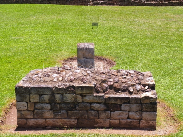Altar Q. One of the most famous pieces at Copan due to its unusual format, the altar represents 16 seated dignitaries on all four sides an a glyphic inscription at the top. It stands opposite Structure 10L-16, dedicated to the founder of the dynasty, K’inich Yax K’uk’ Mo’. The glyphic names are shown beneath each ruler, almost as if they were thrones. The exception is K’uk’ Mo’, whose name is inscribed on his headdress. The text across the top of the stela alludes to five events, three during the founder’s reign and two during that of his final successor, in keeping with the function of the monument.