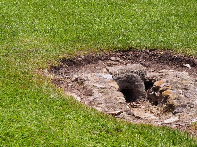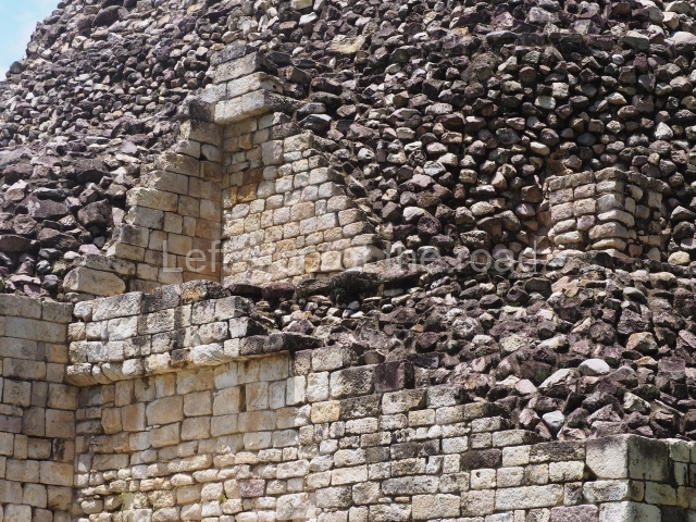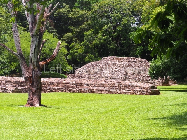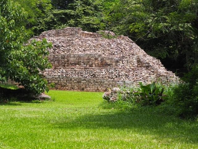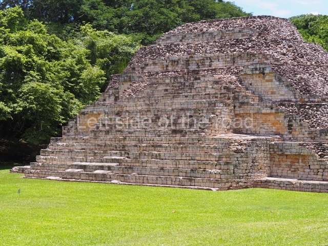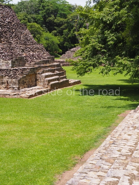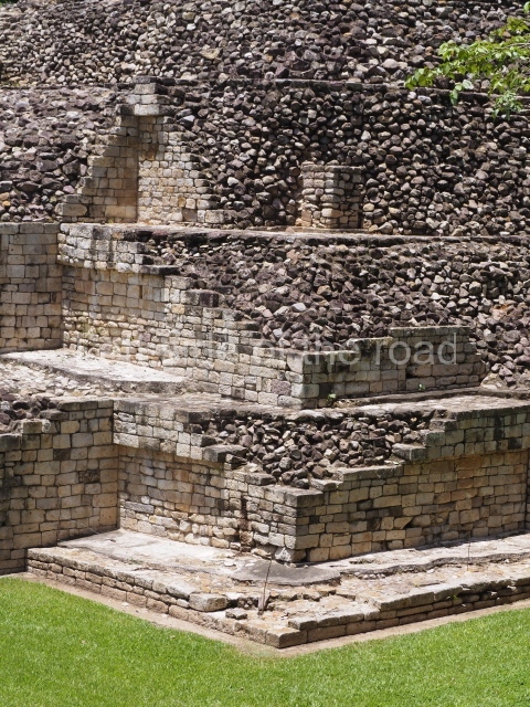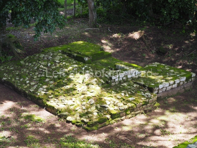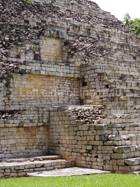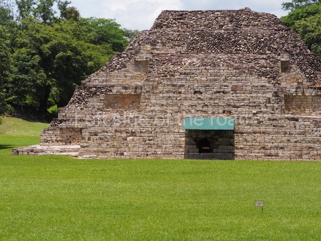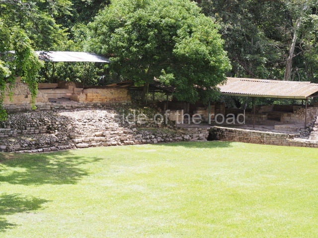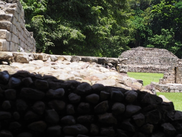 Situated on the west side is Structure 22A, known as the Popol Nah or the House of Council, whose upper facade depicts geometric patterns representing a mat; it once contained glyphs alluding to communities or districts that were part of Copan, as well as a few dates from the ritual calendar. Behind Temple 22A stand the ruins of the temple that once graced the top of Structure 26; situated between the two buildings is Structure 230, which has the same design of interior rooms. It was once decorated with bones and skulls but these are now on display in the Sculpture Museum. Returning to the East Court, situated on the west side of Structure 22 is Structure 21A, which has two bays side by side; beyond it are the ruins of Temple 21, known as the Temple of Knives because of the sculptures associated with it. Structures 20 and 19, whose main facades faced west, once flanked the west side of the court but were lost to the river. Temple 20 is known as the House of the Bats after the sculptures of these animals that were found there but are now on display in the site museum. Life-size sculptures of jaguars stand on the platform preceding these temples. Situated at ground level are the tunnels leading to the sub-structures of temples 22, 21A and 20; the tunnels come out at the gap left by the landslide, revealing the stratigraphic sequence of the Acropolis. It is also possible to see the Ante substructure with its Peten-style apron moulding, masks and glyphic steps. The entrance on the south side of the plaza leads to the sub-structures of Temple 10L16, permitting a view of the partial remains of the Rosalila Temple and other constructions.