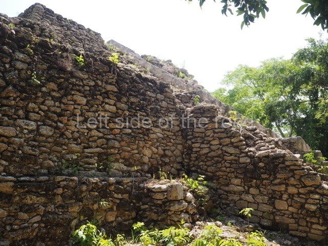 This is an irregular quadrangle (60×45 m) with a single access on the west side and an average height of 10 m, the result of several construction phases. Parts of towers with steep non-functional stairways typical of Rio Bec architecture have been recorded on the east and south sides. These were added in ancient times as fillings for the Acropolis. In the upper section is a large courtyard with several rooms on the south and west sides. The constructions in the south-west section seem to have been the latest additions, around AD 1000.
