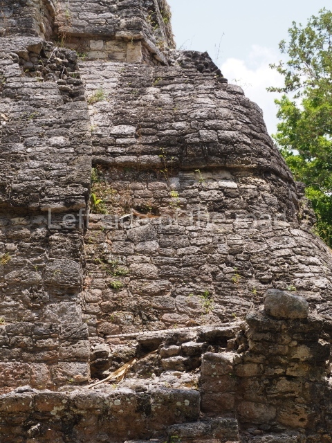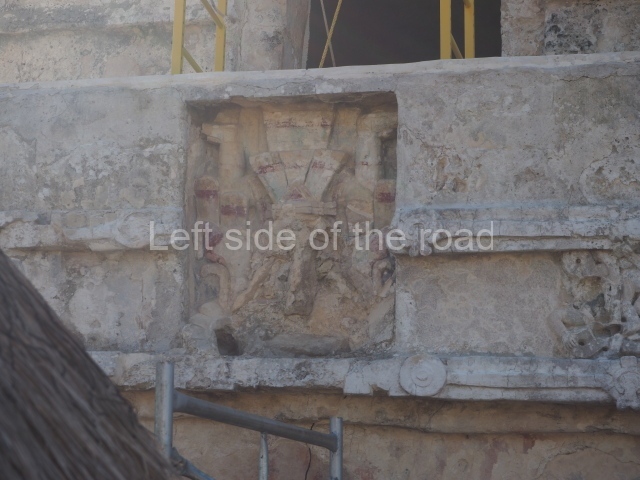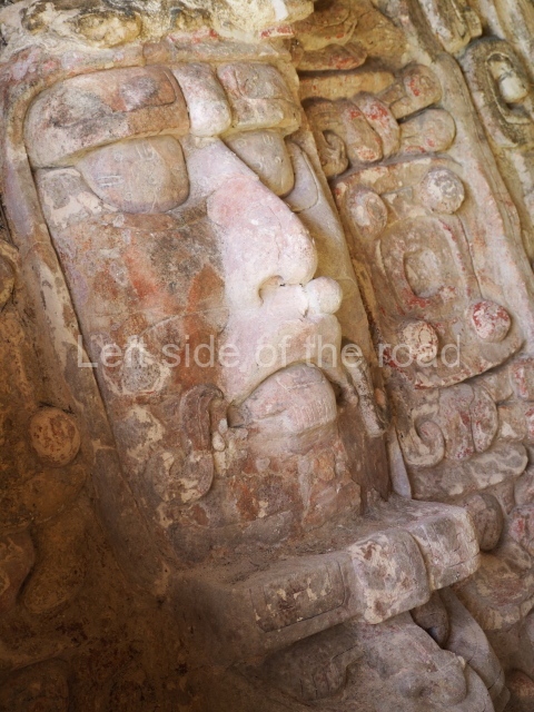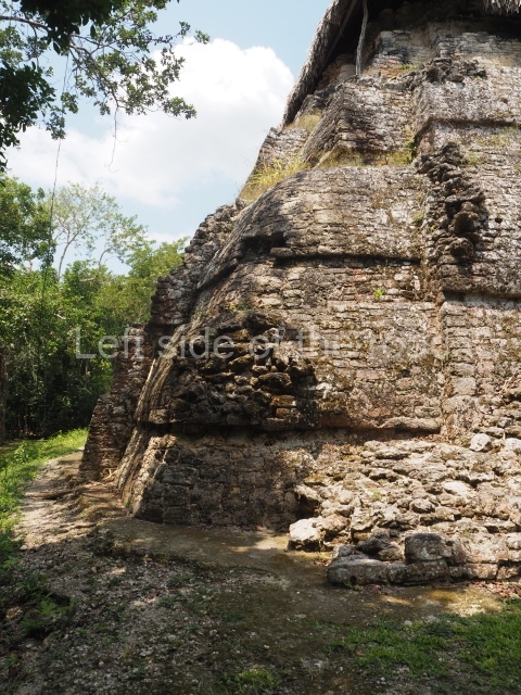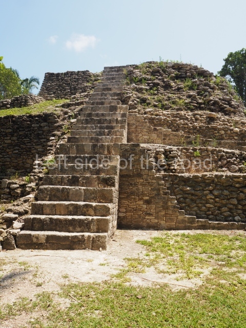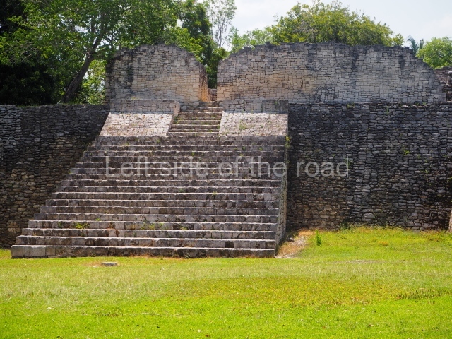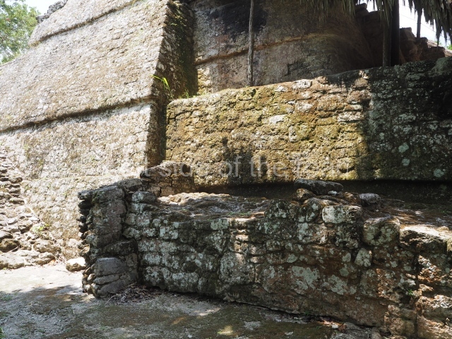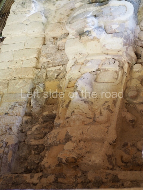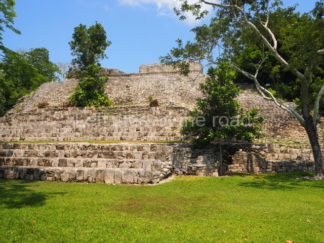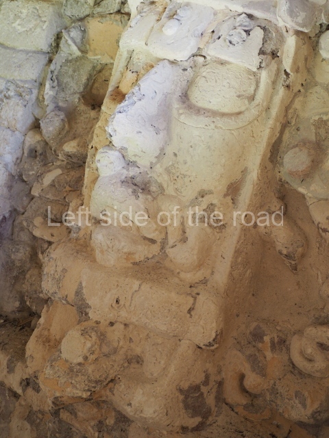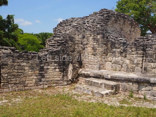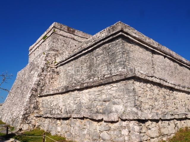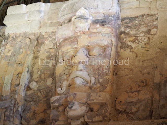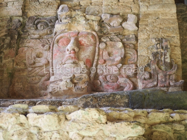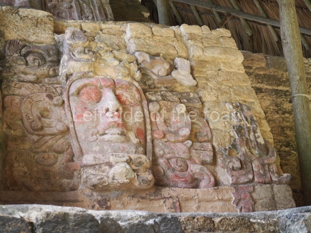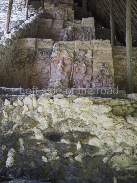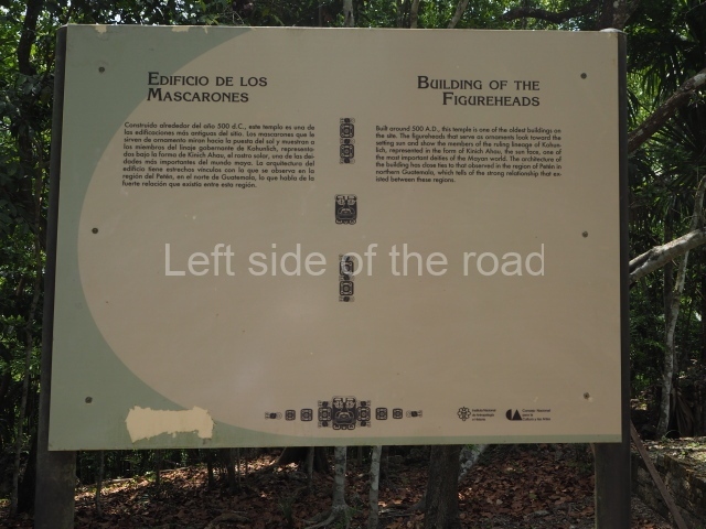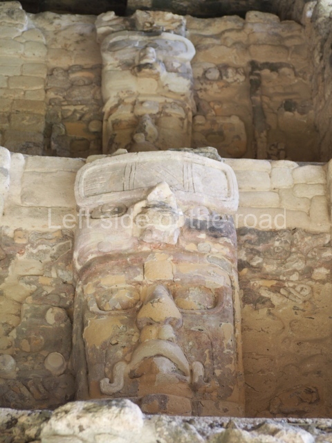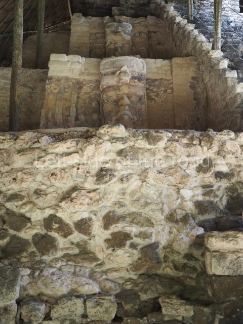This construction in the Peten style adopts the form of a four-tier platform with a temple at the top comprising five very narrow rooms. The corners are rounded and it has a single stairway, on the west side, flanked by stucco masks. The faces symbolise the sun god at various points of its passage across the firmament. The construction is approximately 25 m long and 20 m wide, and stands nearly 11 m high, not including the guano palm roof that protects the stucco pieces. During the second half of the 20th century the masks were illustrated as symbols of Quintana Roo.