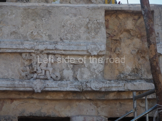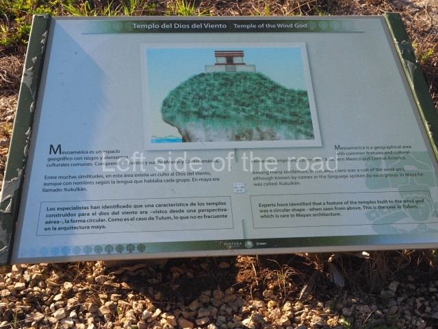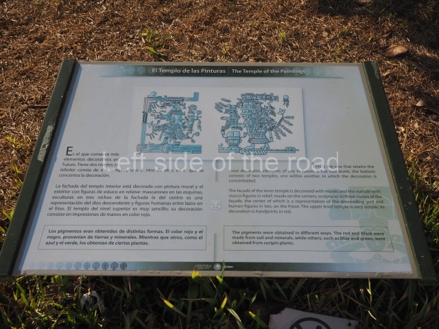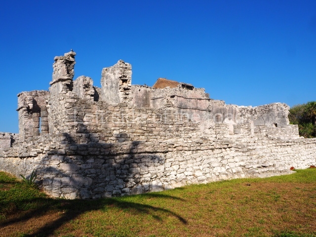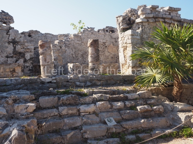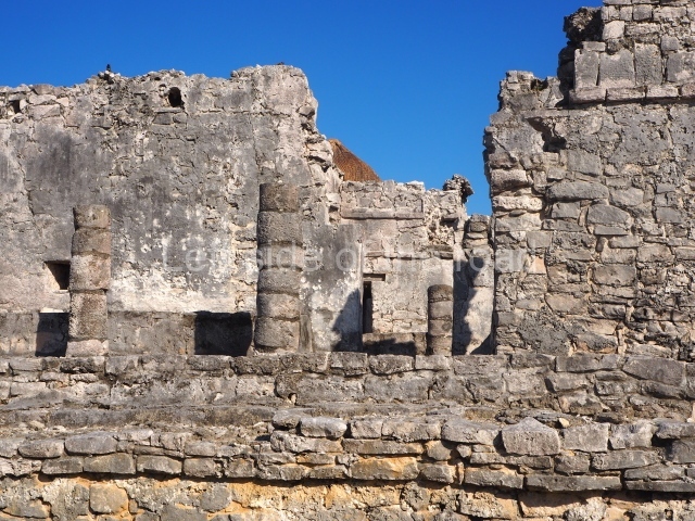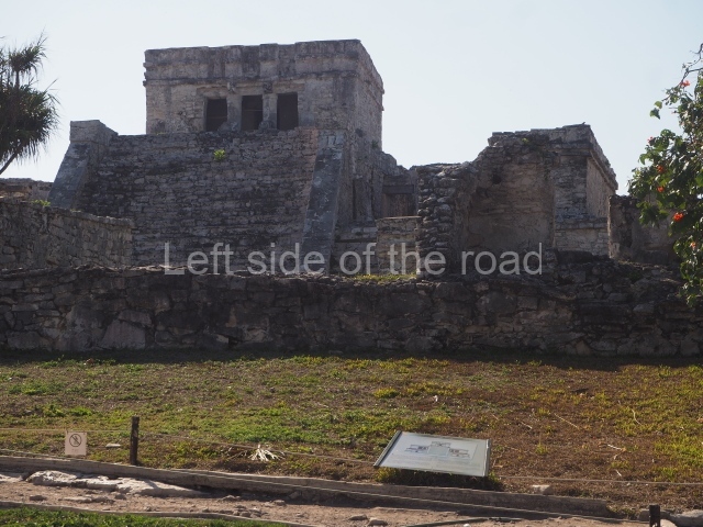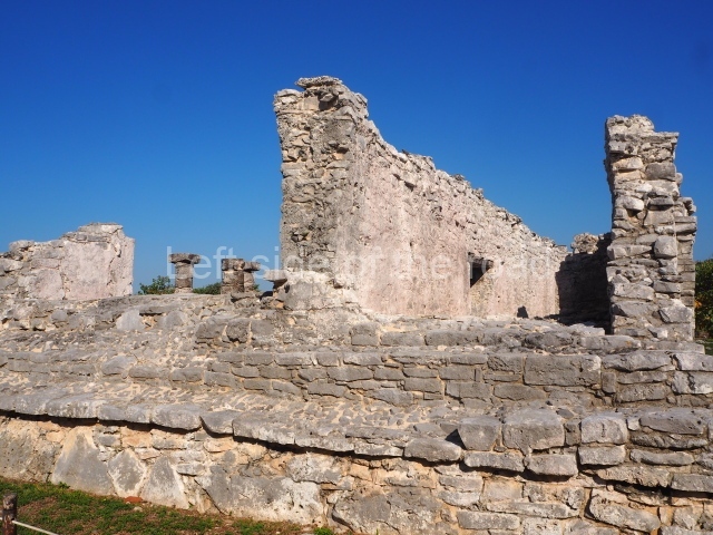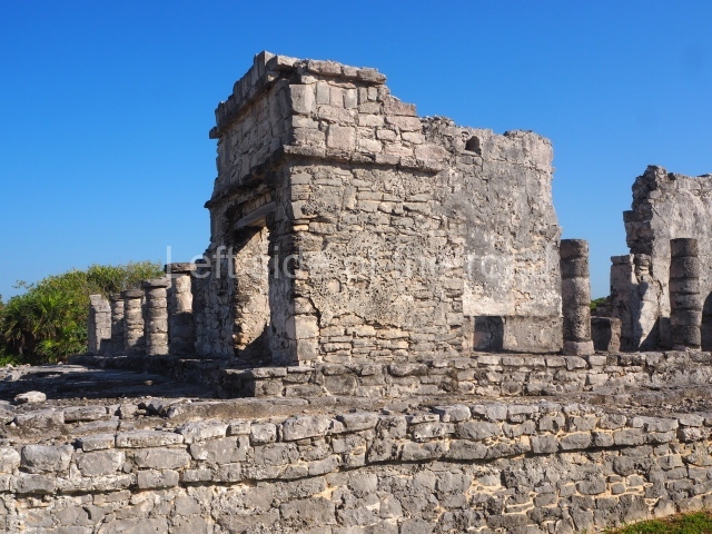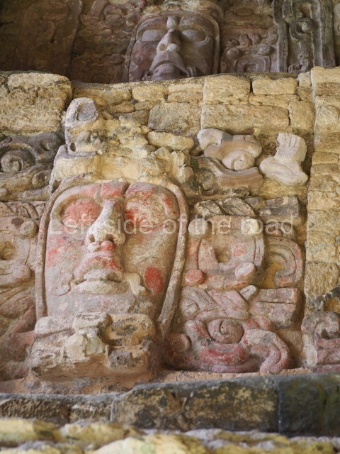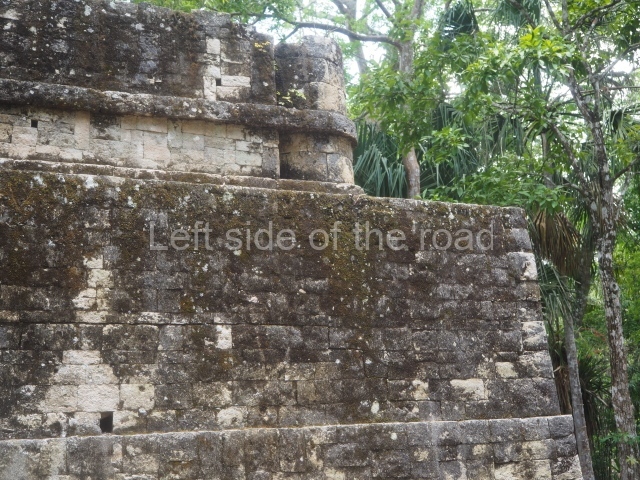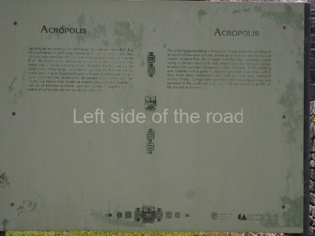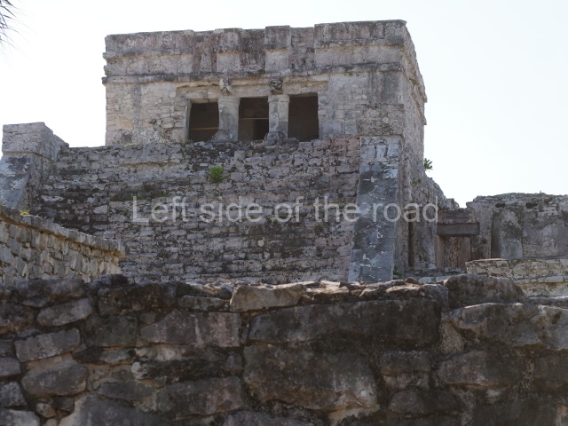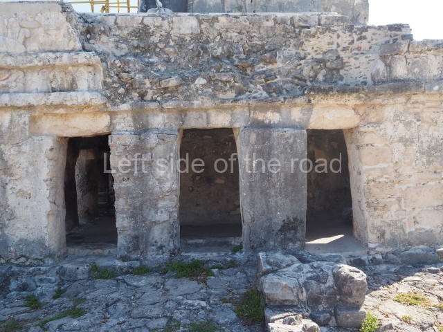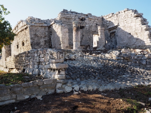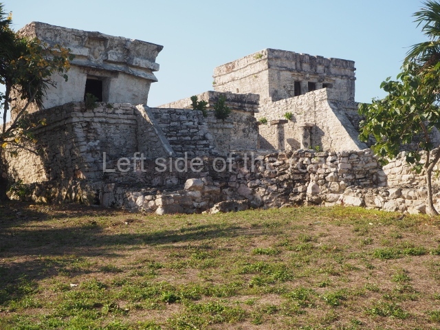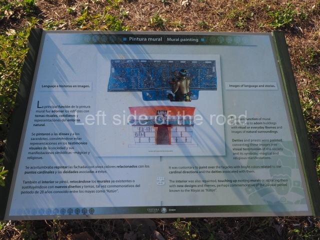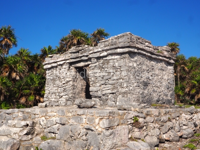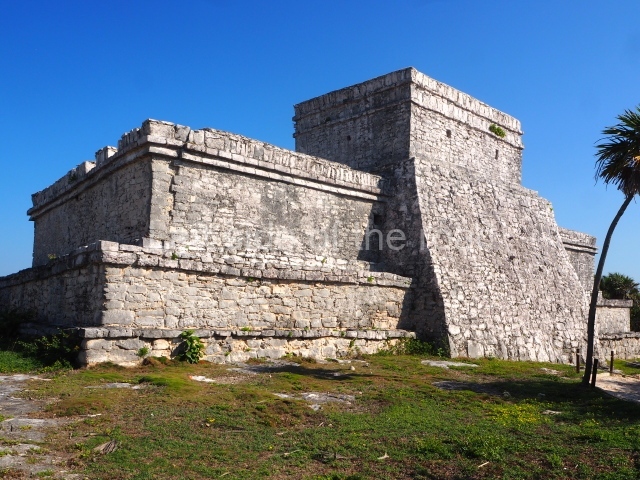 This construction in the Peten style adopts the form of a four-tier platform with a temple at the top comprising five very narrow rooms. The corners are rounded and it has a single stairway, on the west side, flanked by stucco masks. The faces symbolise the sun god at various points of its passage across the firmament. The construction is approximately 25 m long and 20 m wide, and stands nearly 11 m high, not including the guano palm roof that protects the stucco pieces. During the second half of the 20th century the masks were illustrated as symbols of Quintana Roo.