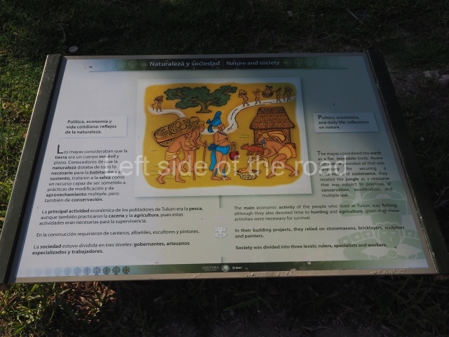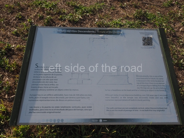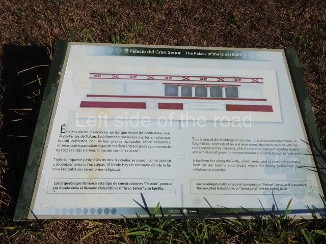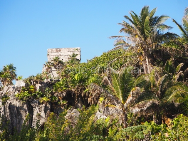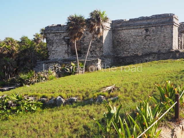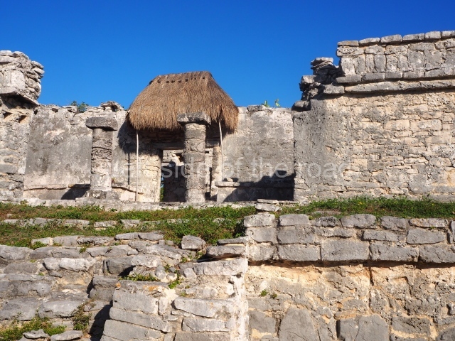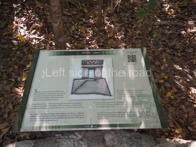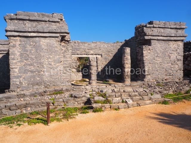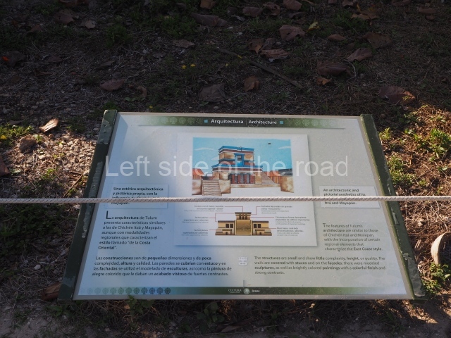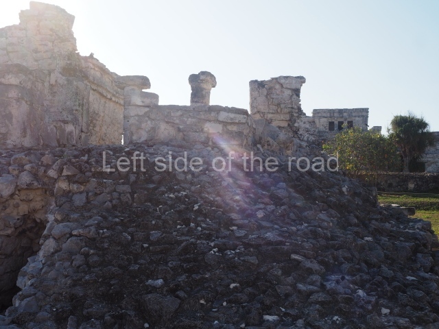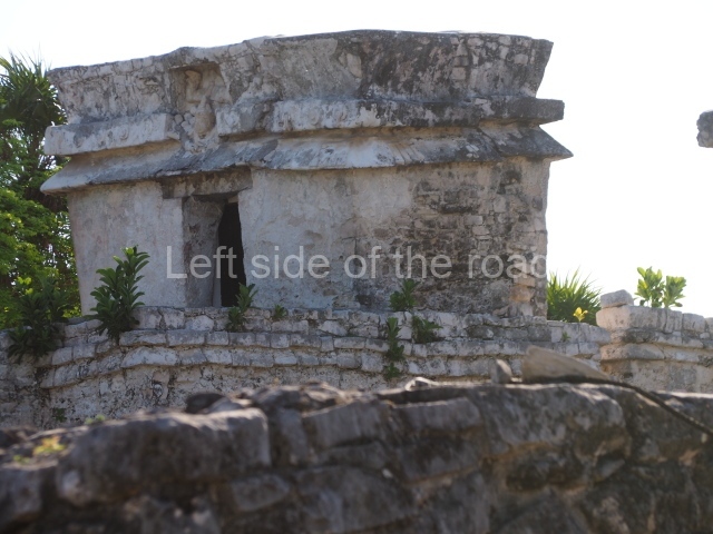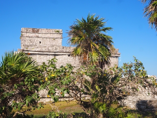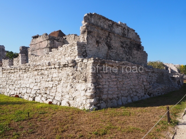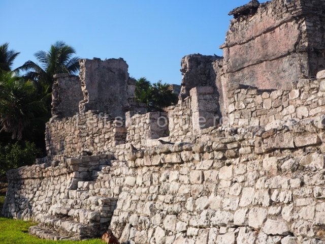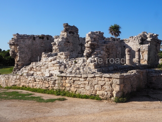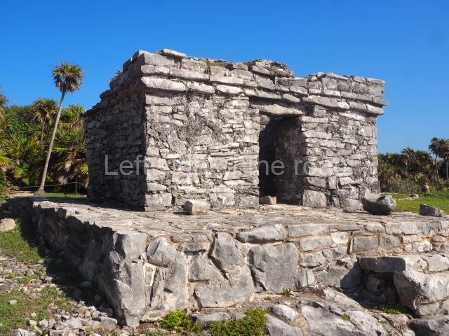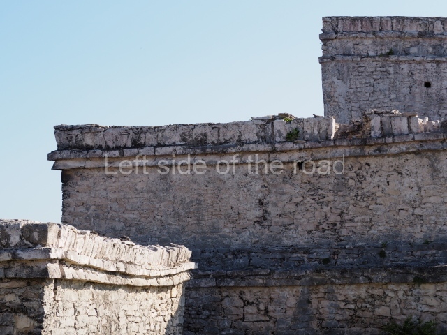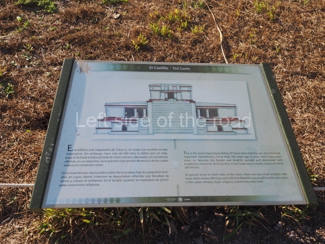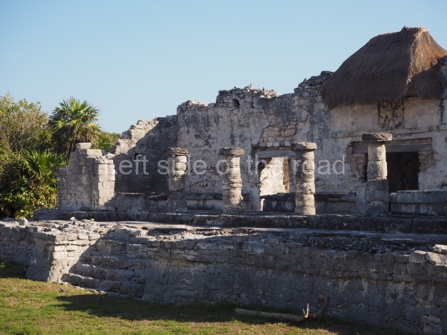 This construction in the Peten style adopts the form of a four-tier platform with a temple at the top comprising five very narrow rooms. The corners are rounded and it has a single stairway, on the west side, flanked by stucco masks. The faces symbolise the sun god at various points of its passage across the firmament. The construction is approximately 25 m long and 20 m wide, and stands nearly 11 m high, not including the guano palm roof that protects the stucco pieces. During the second half of the 20th century the masks were illustrated as symbols of Quintana Roo.