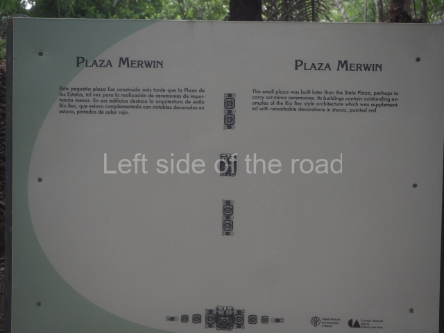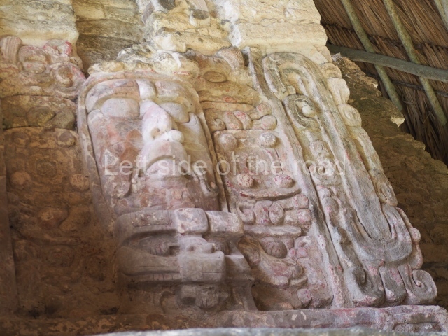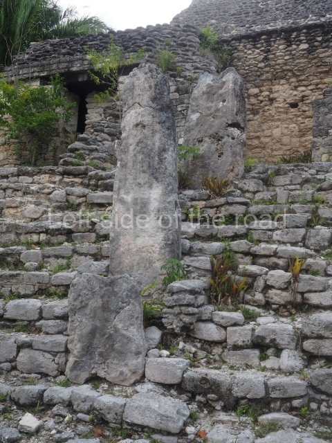 This monumental space is situated north of Merwin Plaza. It takes its name from the various monoliths that can be seen on the east stairway. Its principal axis runs north-south and it had several rooms accessed from the east and west. A masonry roof comb displays six stucco figures seated on a type of throne that adopts the form of a giant mask of the Earth Monster or Sacred Mountain. The figures may have represented rulers of Kohunlich.