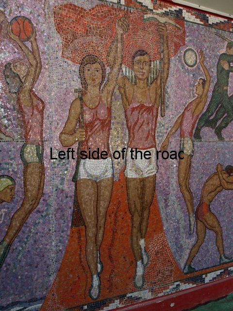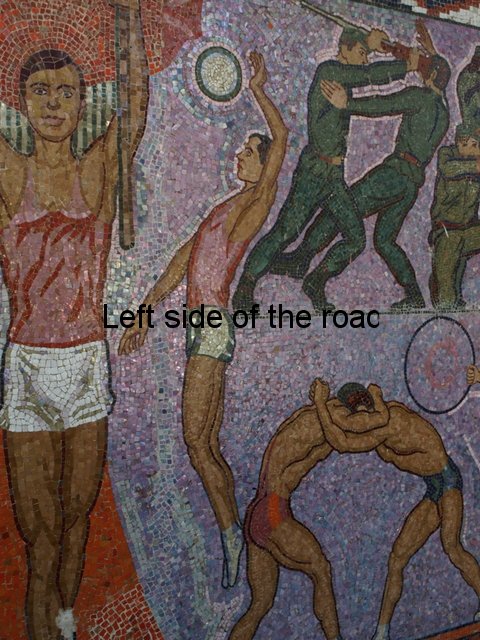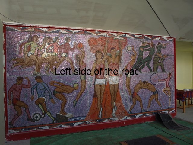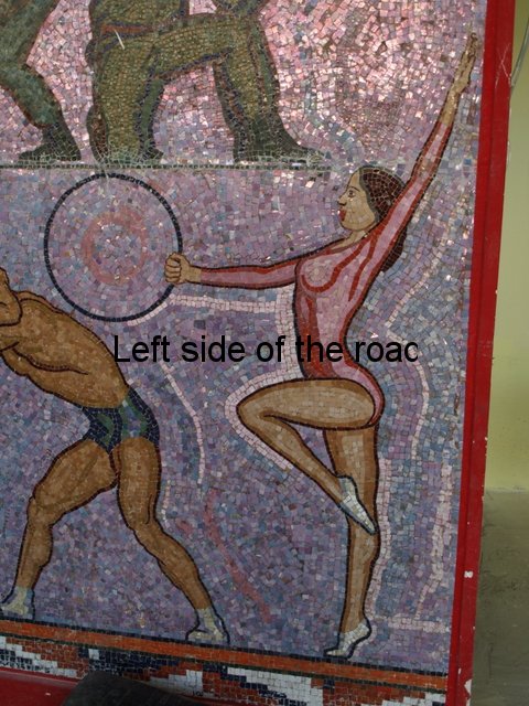 With the most recent ‘renovation’ this common area has been broken up and a substantial dividing wall now exists between the mosaics. I had to go back early the following morning to meet up with the key holder of the right hand section as this is now the location of the local weightlifting (peshëngritje) club, the mats and weights in the area in front of the Socialist work of art. They could use the image of the weight lifter in the traditional panel as a logo, to give their club a distinctive image but I doubt if anyone has ever thought of that.