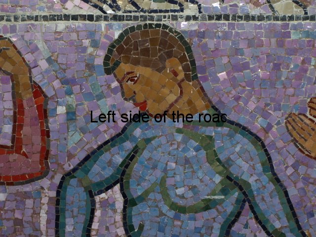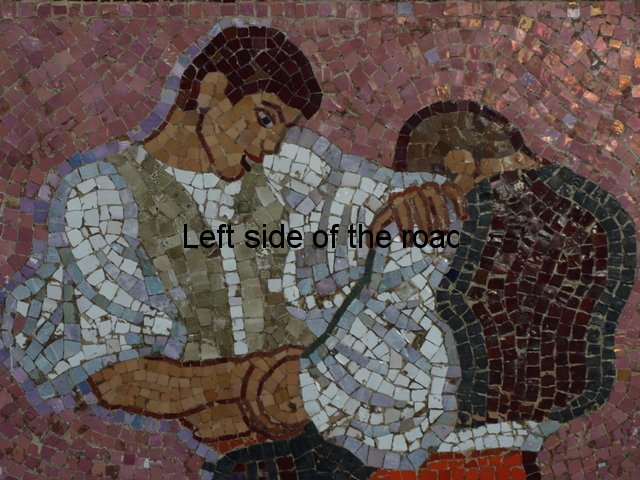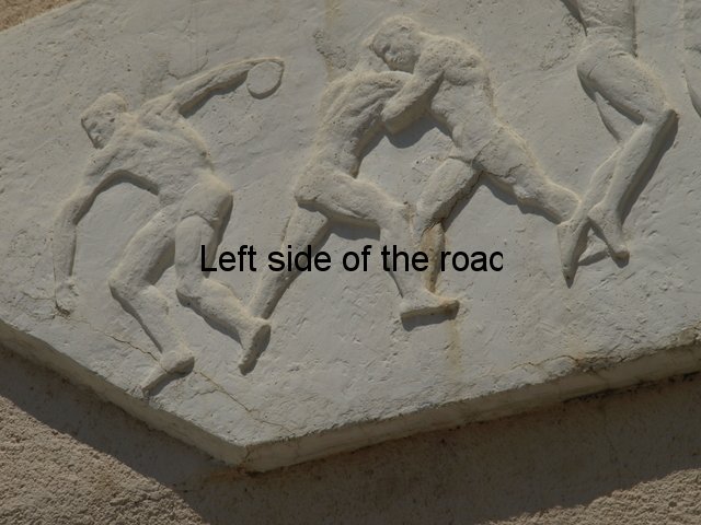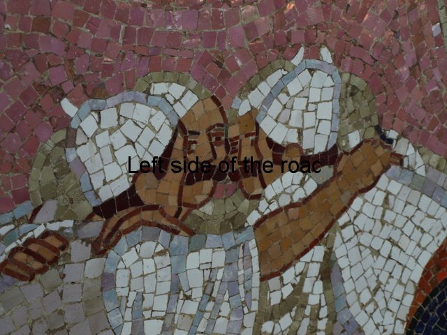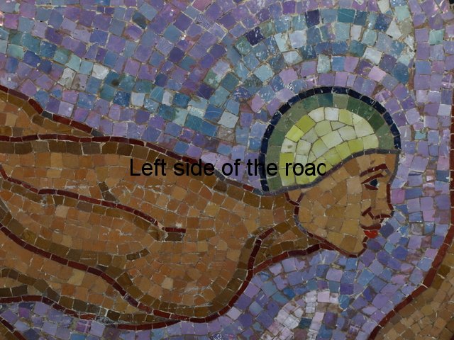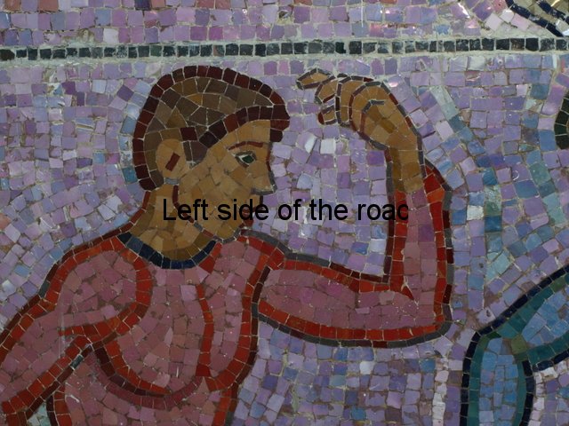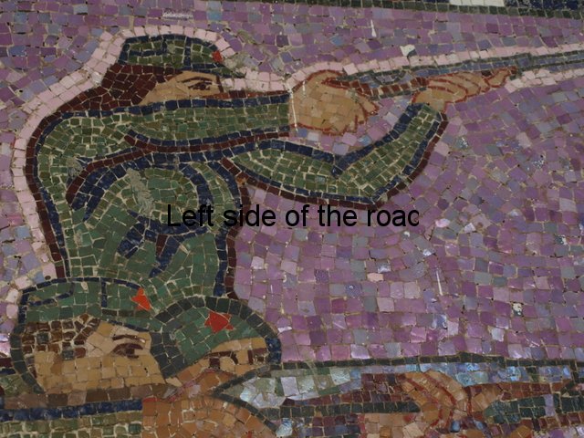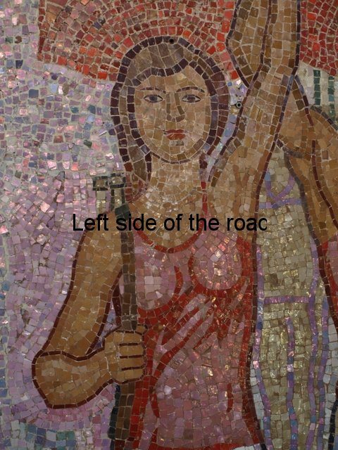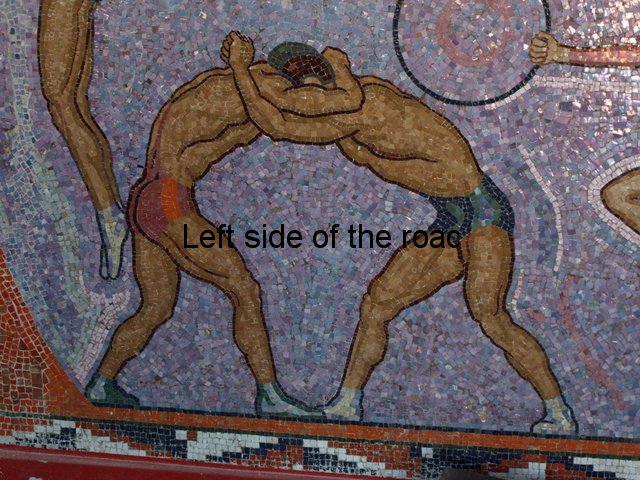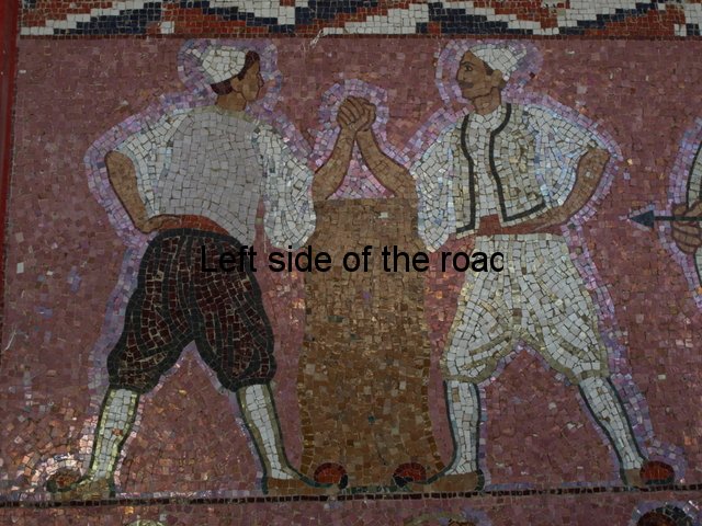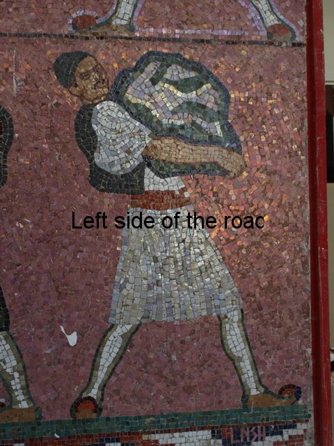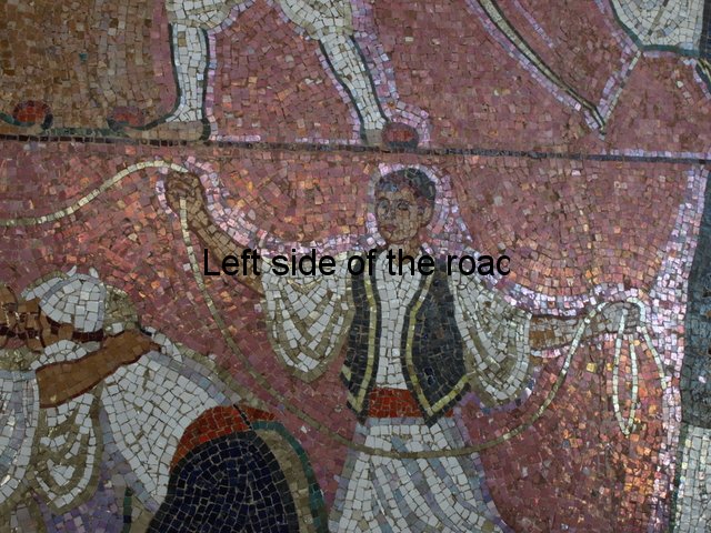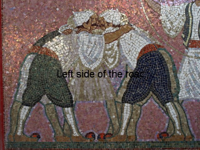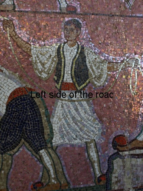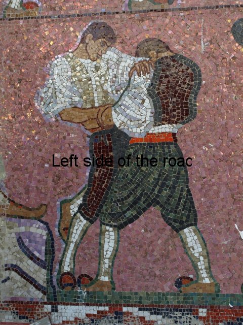 The first mosaic is seen inside the left hand entrance to the building. Here all the individuals are dressed in the everyday clothing of the peasantry up to the end of the 19th century. They are engaged in what we now call sport but would have been more a form of local entertainment in the past, as well as competition between the young men to attract the attention of the nubile women as has been the case in tribal societies throughout the world for millennia – there’s only one woman portrayed on this mosaic but she is there as part of a political statement rather than a participant in competitive activity.