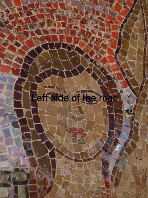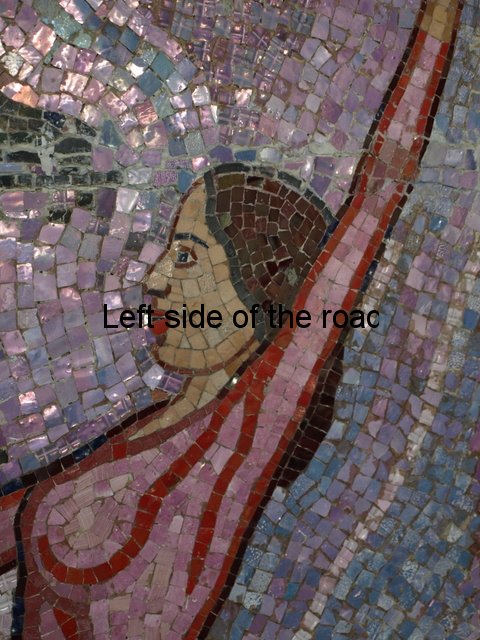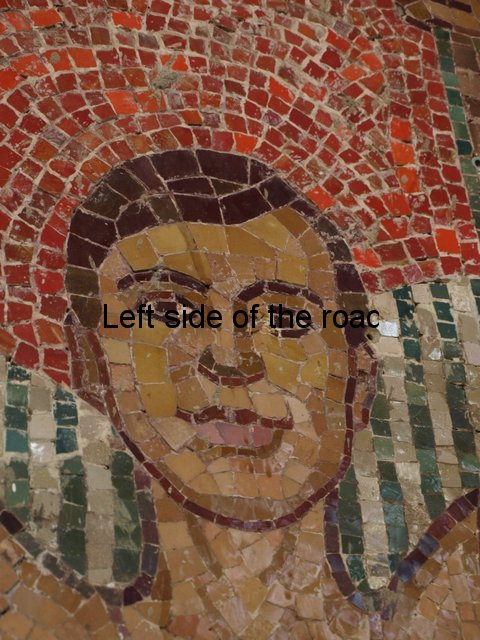 Their stance is mirrored in that their right foot is forward and the left close behind, partly hidden. It is here that the first signs of damage, on either of the mosaics, appears. The tiles around the male’s ankle have fallen away and it appears that a somewhat amateurish repair has been made, basically filling the area with plaster. But there is also evidence that this area has had problems in the past as there’s a sizeable area to the right of his feet where the tiles have been replaced but in such a manner that the repair is evident.