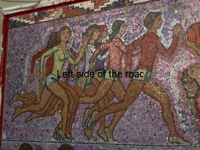 In the top left hand corner there’s a group of seven young women taking part in a medium to long distance run – they’re all bunched up which wouldn’t be the case in a sprint. They are in various colours, both in their shorts and vests. This is a very much more modern representation of women who have come a long way in a short number of years. Pre-liberation the role of women in Albania was very different from what it became under Socialism. After 1944 women were involved in all aspects of society and it should be remembered that there was only one woman depicted in the ‘traditional’ panel so the inclusion of this large group tells the story of how things had changed in a matter of very few years.