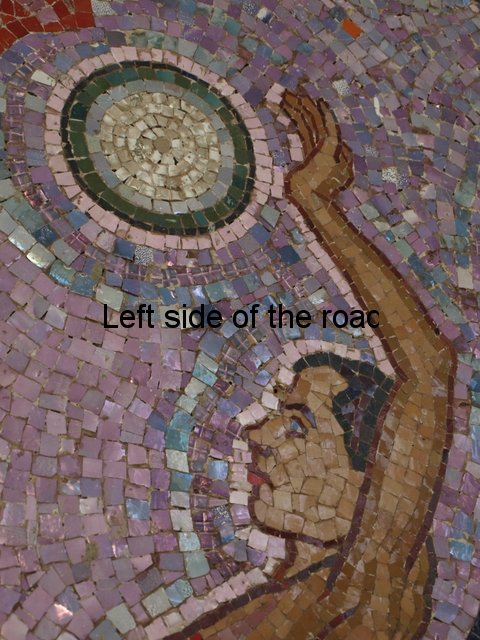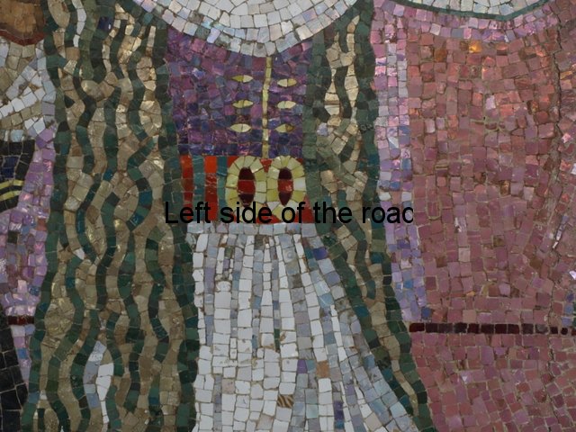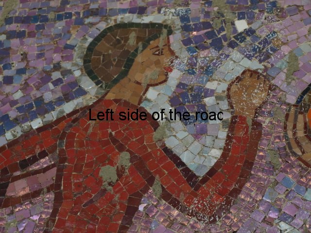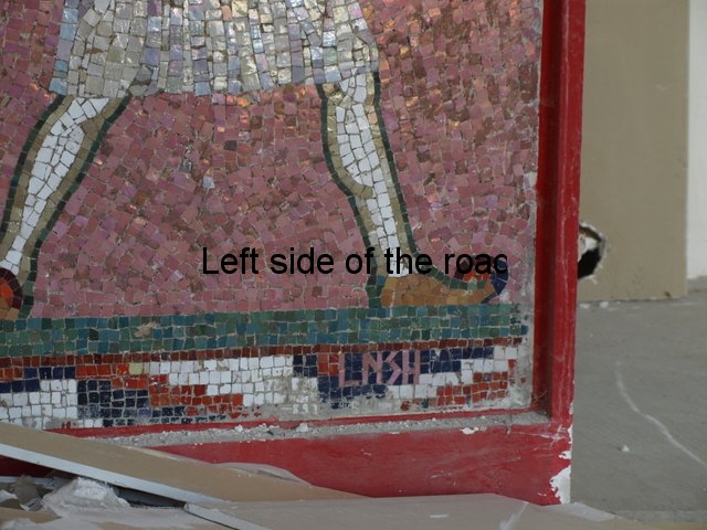 Access to the mosaics isn’t easy. I was able to convince someone in the office (accessed from the entrance at the back of the building) to allow me to see the traditional panel. We went across the basket ball court and then through a temporary barrier to come to an area that is part building site, rubble and debris strewn around.