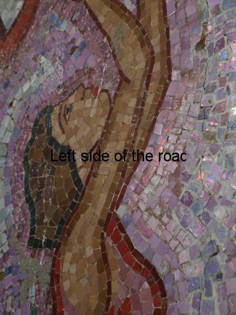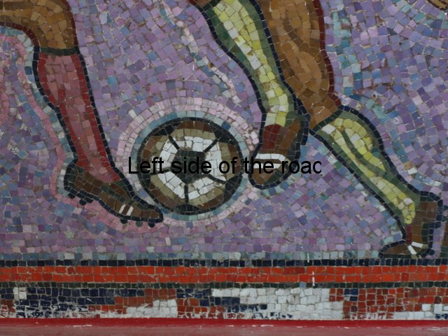 As I started to look in a detailed manner at the two mosaics I started to think that the images were so different that more than one artist was involved. Then I realised that the same letters, NLSH, can just be made out on the very bottom frieze, between the feet of the footballer on the extreme left, in an area where there has been some slight damage. This made me think that it’s possible the letters don’t refer to an individual but to a collective, the letters SH being the abbreviation of Shqipëri (Albania). So the letters could stand for an artistic grouping – but that’s just speculation