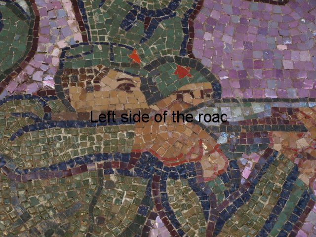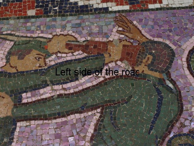 As in the previous mosaic the central figures take up (almost) the whole height of the panel. Here again it is a young man (on the right) and young women (on the left), but in an image that is full of meaning.