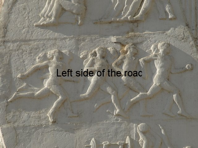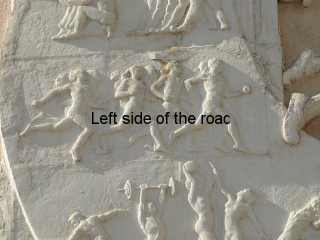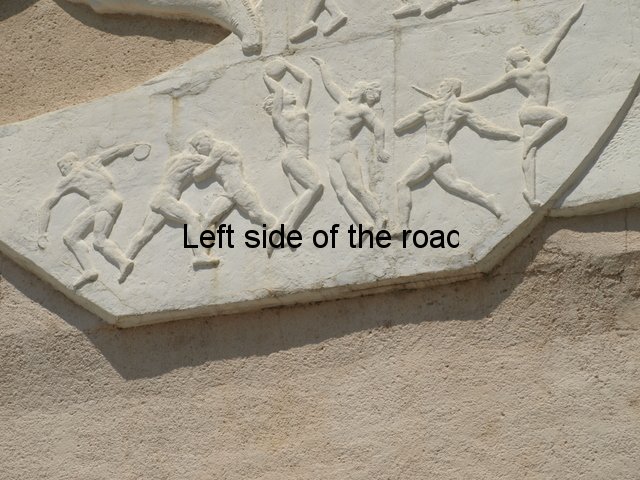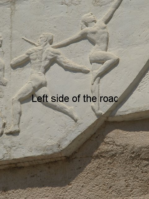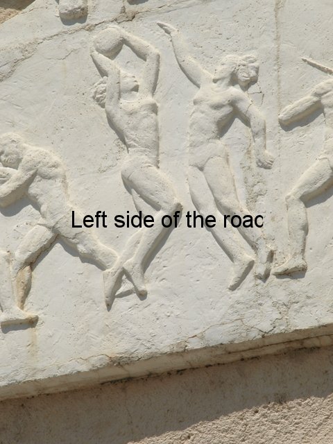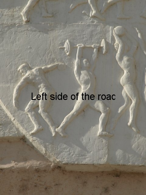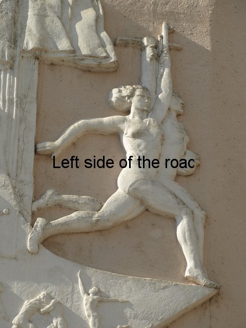 The main subjects of this bas-relief are two athletes, a man and a woman, running flat out, their legs as wide apart as is possible when in a race. They are running on the bottom curve of the ‘J’ and their hands reach as high as the flags. There’s obviously a classical reference here, the only difference being that the two figures are clothed, the man with shorts but bare-chested whilst the female wears shorts and a T-shirt (female public nudity not being an element of Socialist Realism). On their feet it is easy to make out that they are wearing running shoes.