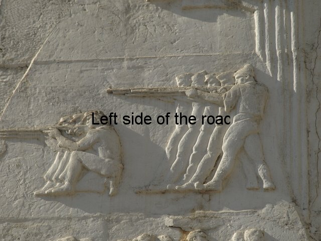 Although the primary focus of this bas-relief is towards the front of the building, looking from right to left, the firing men and women are directing their anger towards the back of the structure, otherwise they would be shooting their comrades in the back.