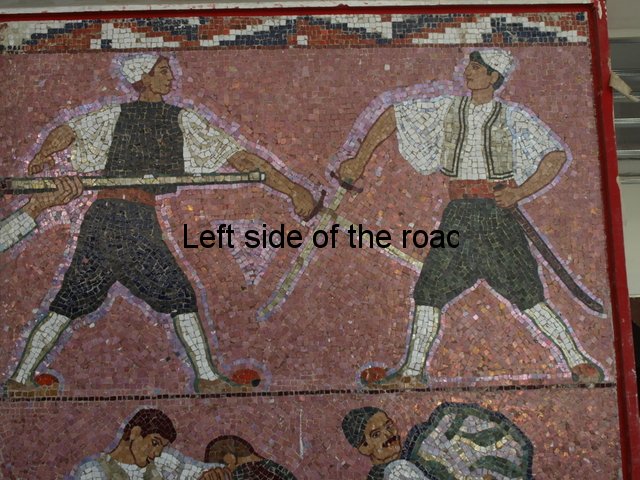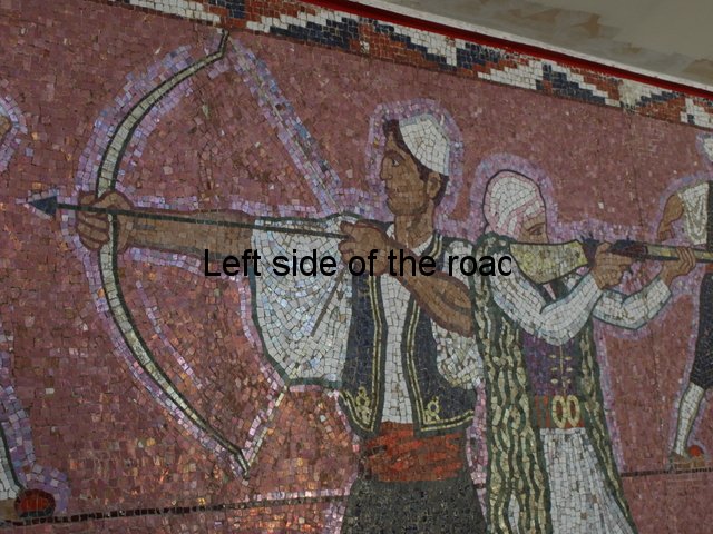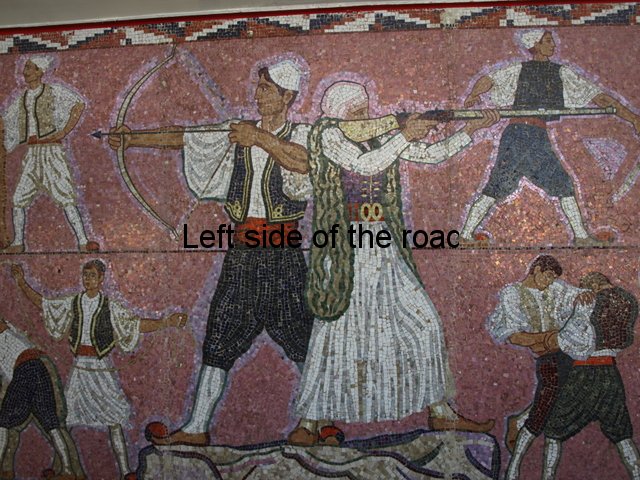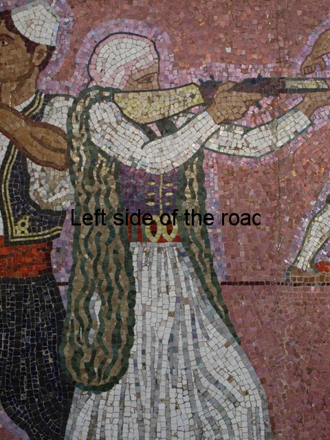 This last statement is not made as a criticism of the imagery on the mosaic. Women were involved in the actual fighting against foreign invaders from very early times. This was especially the case from the late 19th century and the beginning of the 20th. The ‘People’s Heroine’ Shote Galica, who is often depicted in photos as heavily armed as any man, died young (at the age of only 32) and was a virtual legend in her time. She was commemorated during Socialism by the marking of her grave in Fushe-Kruja and a large bust of her in Kukës.