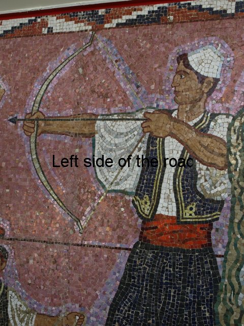 Two central figures dominate the mosaic. One is a male who is on the point of loosing an arrow from his bow. Although the bow and arrow was the precursor of the gun this weapon doesn’t appear that often in the imagery of the late 1960s to the mid 80s. Yes there are a lot of them shown on the murals in the Skenderbeg Museum in Kruja and might appear as the accoutrements of war in other images, but rarely as a truly aggressive weapon of war. And the Kruja murals are a relatively late addition to the pantheon of Socialist Realist Art and appeared at a time when the politics in the country were starting to undergo major changes.